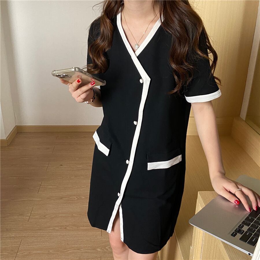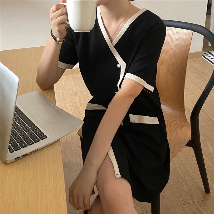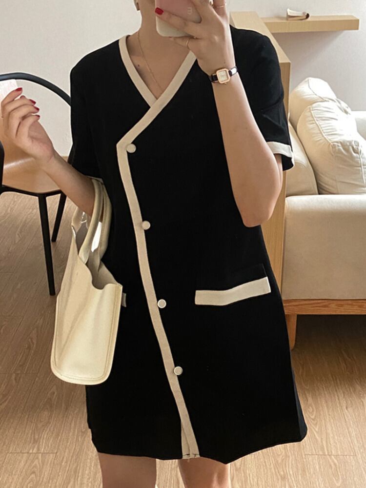 [EWQ] 不規則歌う Lebreasted コントラスト カラー ミニ ドレス半袖ホワイト パッチワーク V ネック ドレス夏 ショート ハーフスリーブ サマー 夏物 Vネック