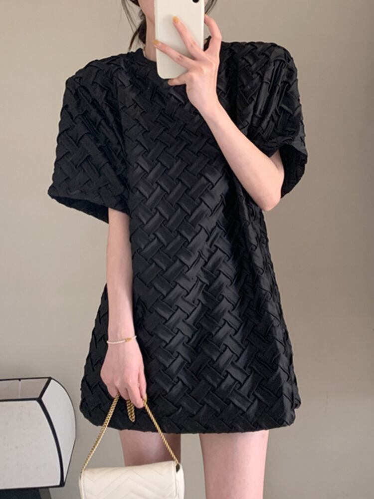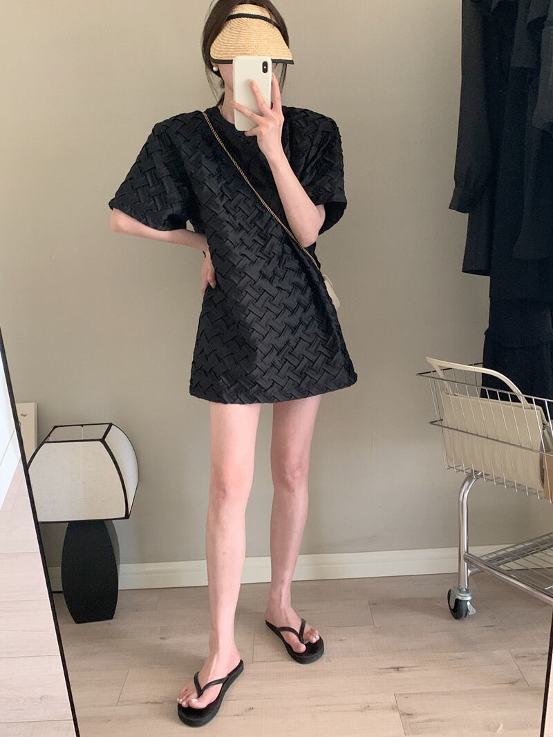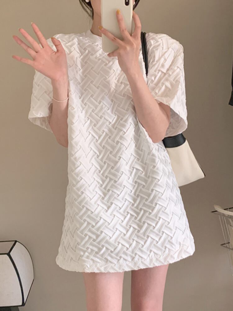 [EWQ] シンプル O ネック Tシャツ ドレス夏ゆったり半袖無地チェック柄ドレス ミニ Vestido Y7549 ショート ハーフスリーブ サマー 夏物 Oネック ソリッドカラー