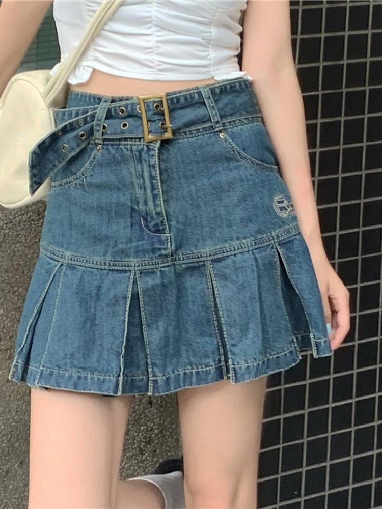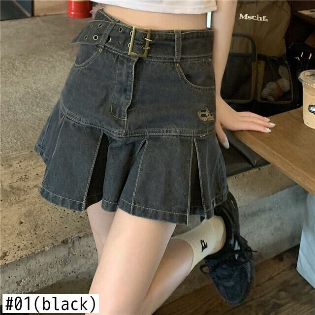 [EWQ] 刺繍デニム ミニスカートフリル スプライシング包帯ショート スカート春夏ブルー ファルダス レッド スプリング 春物 サマー 夏物