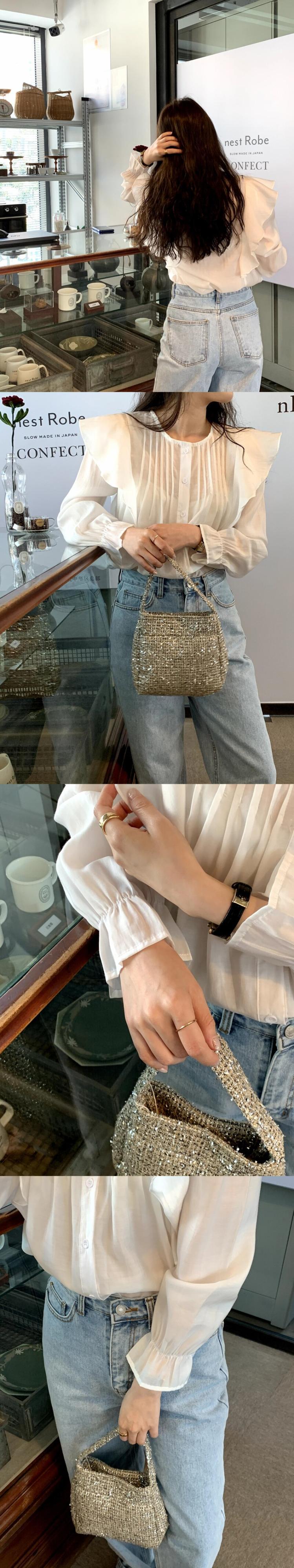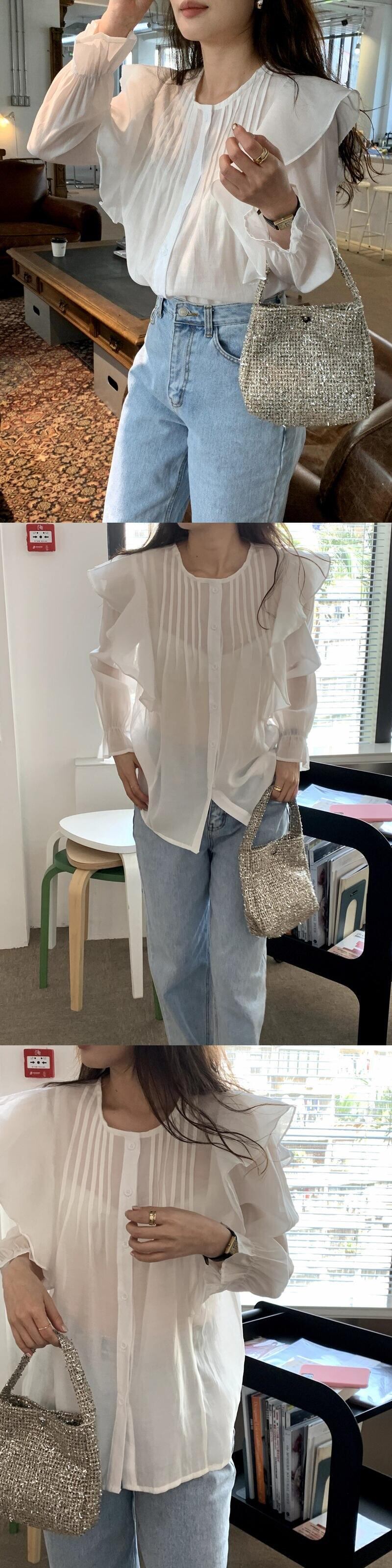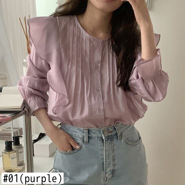 [EWQ] レディース Oネック パネル フリル プリーツ シャツ 無地 フレアスリーブ ブラウス トップス 春秋 トップス 18 スプリング 春物 オータム 秋物 ソリッドカラー