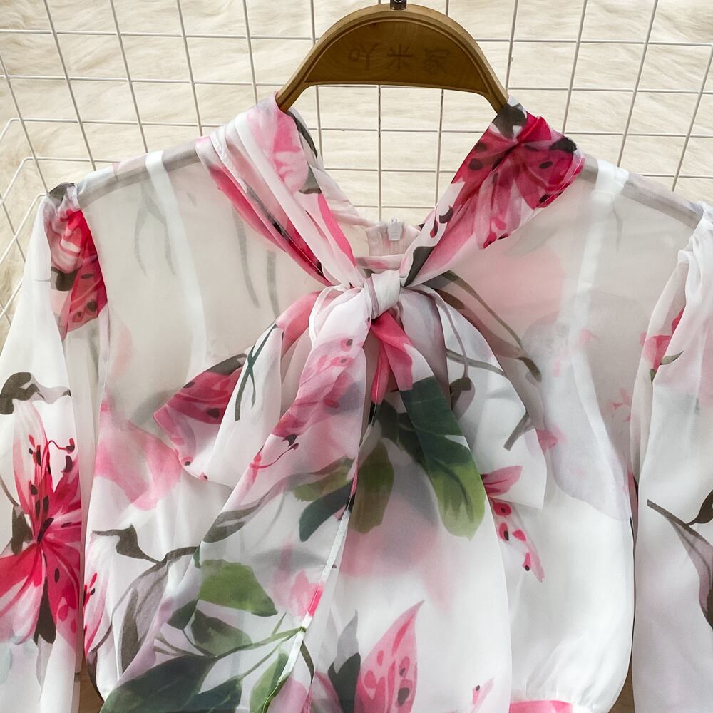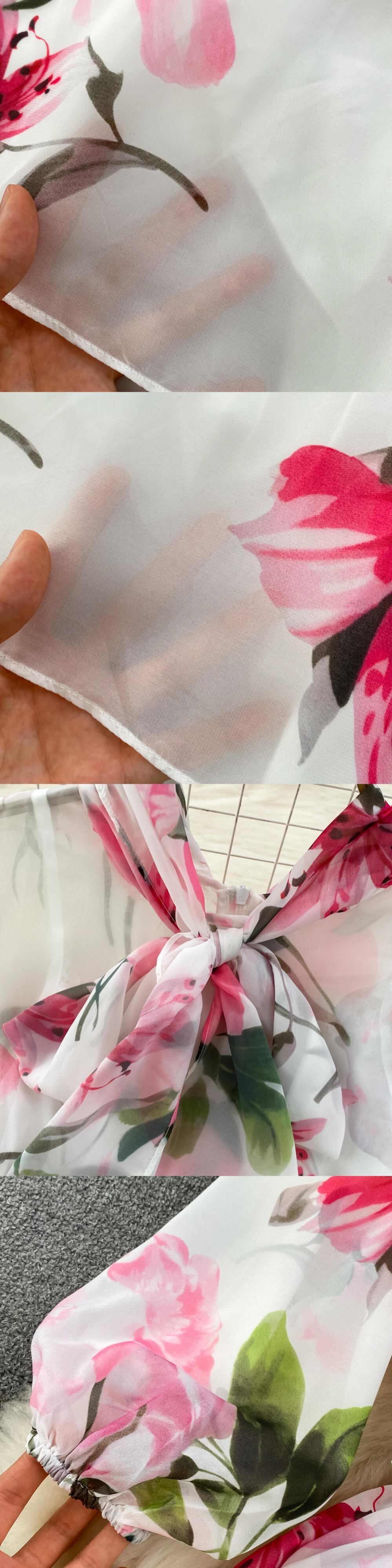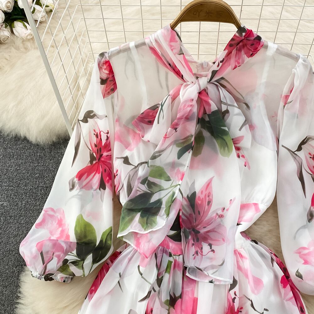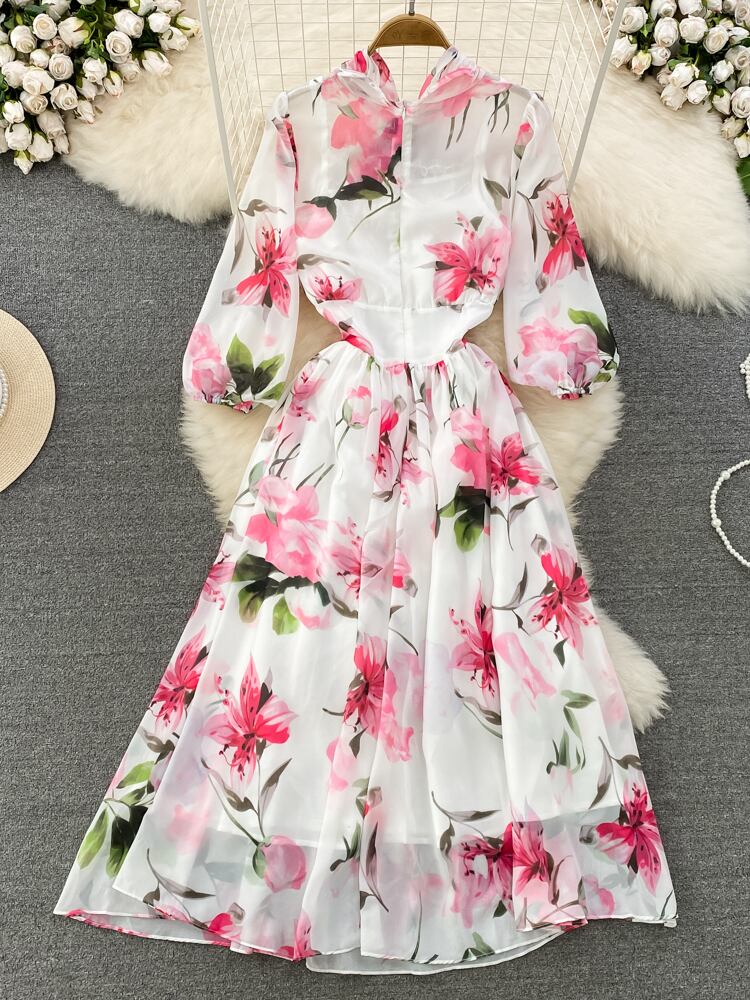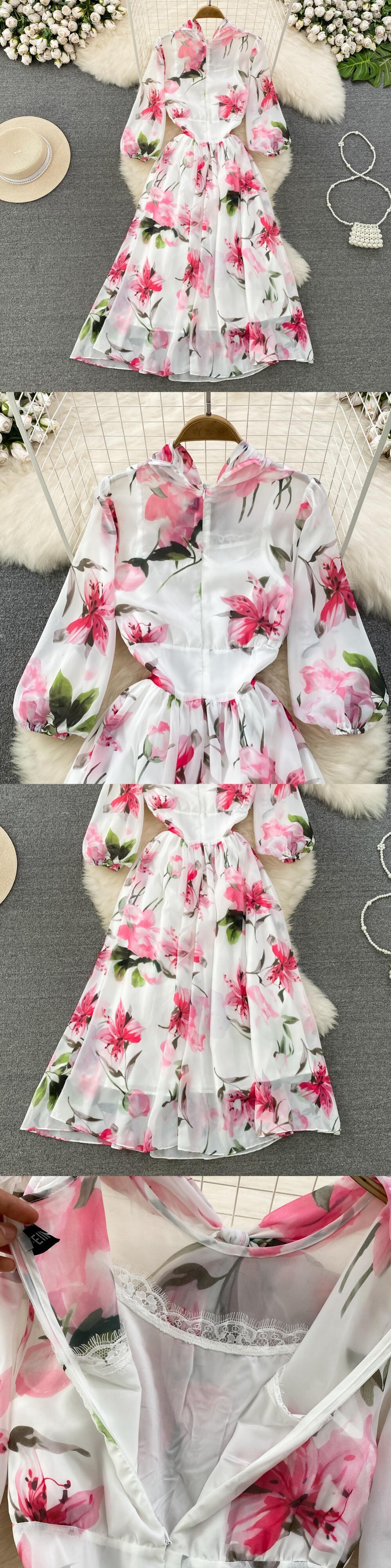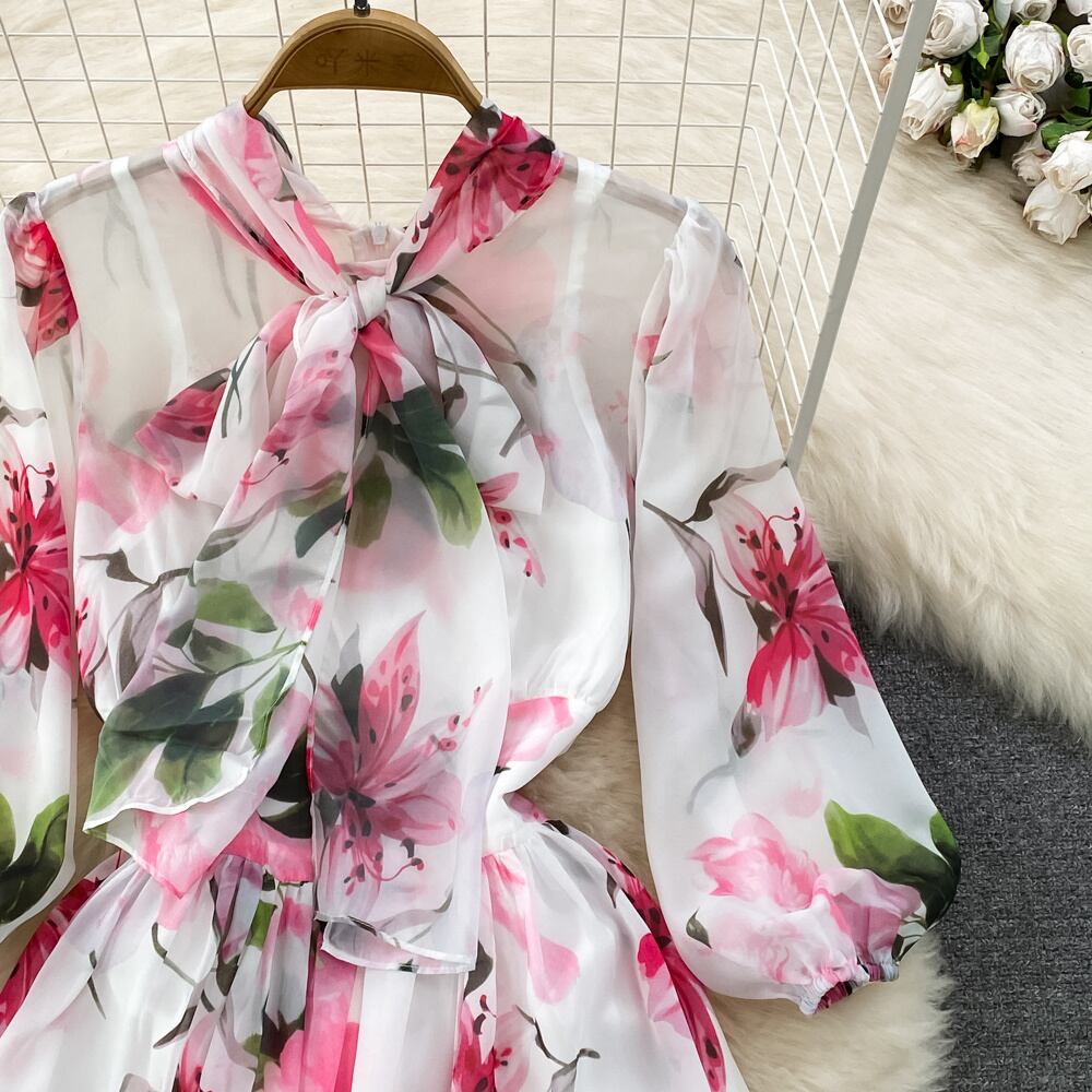 [EWQ] パフ スリーブ プリント レースアップ ドレス コントラスト O ネック シフォン パーティー ドレス夏 Vestido サマー 夏物 Oネック