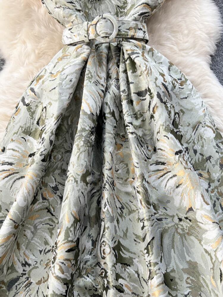 [EWQ] ノースリーブ ジャカード ドレス イブニング パーティー ベルト プリント A ライン ジャーク ドレス O ネック Vestido 春夏 16Y6449 スプリング 春物 サマー 夏物 ハーネス Oネック Aライン