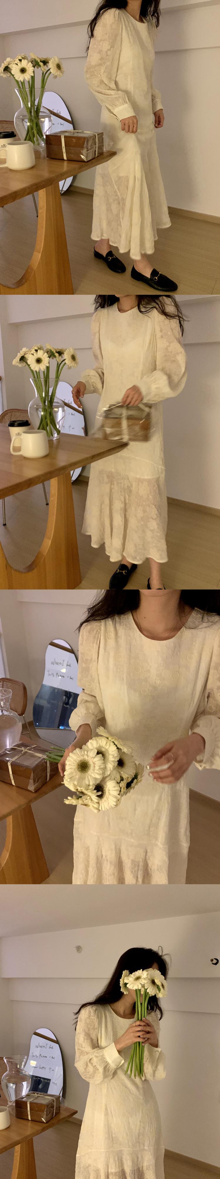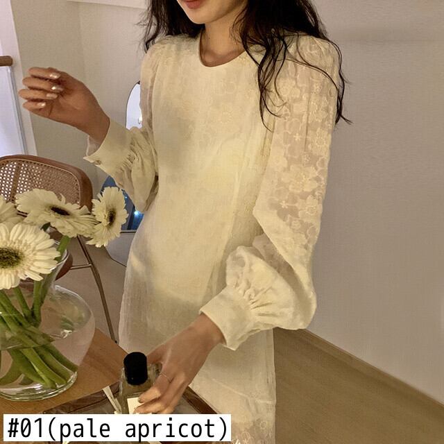 [EWQ] O ネック レース フック花トランペット ドレス パフ スリーブ無地ドレス春秋 Vestido 6Y7089 スプリング 春物 オータム 秋物 Oネック ソリッドカラー フラワーデザイン