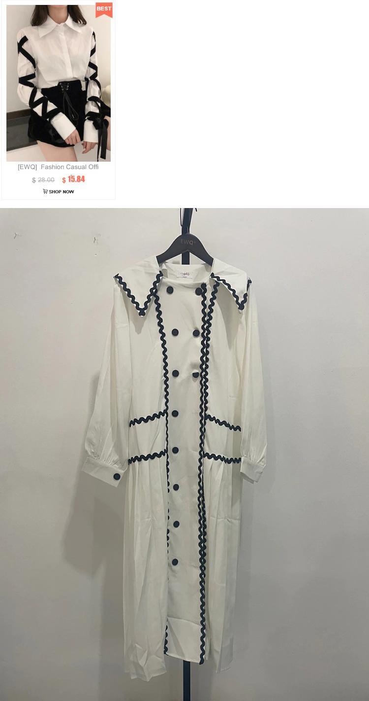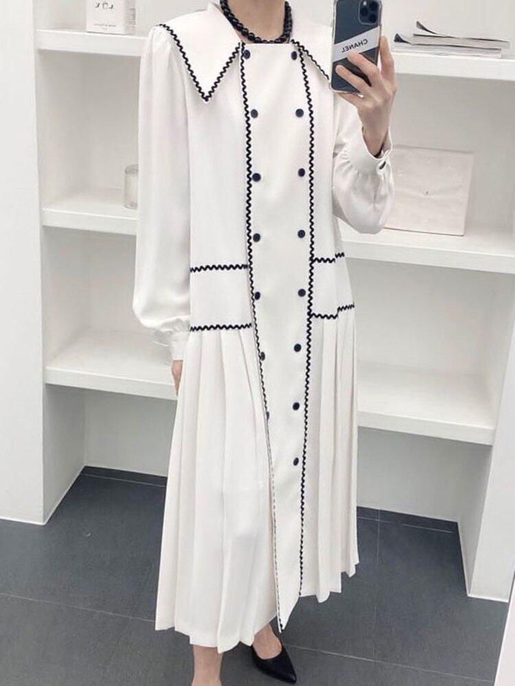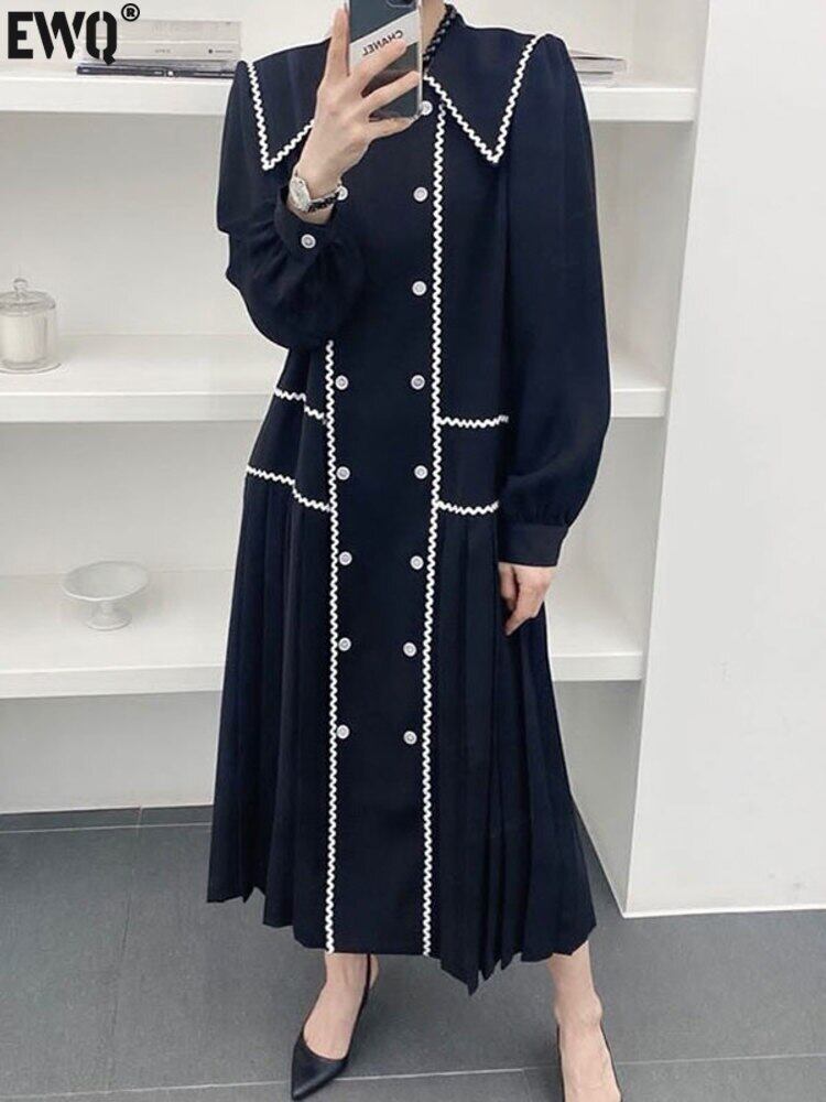 [EWQ] シックレトロラペル コントラスト レース ダブルブレスト長袖パッチワーク プリーツ ドレス春秋潮 ロング スプリング 春物 オータム 秋物