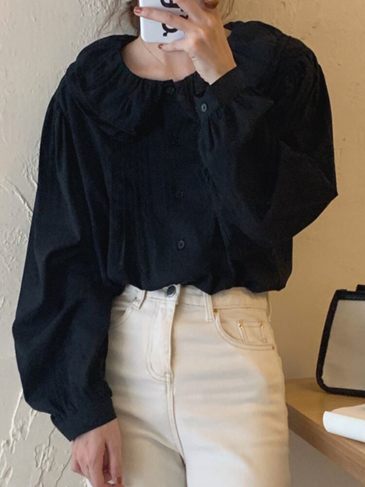 [EWQ] プリーツ ゆったり 無地 長袖 レディース シャツ 春秋トレンド ターンダウンカラー ブラウス トップス 16Y6005 ロング スプリング 春物 オータム 秋物 ソリッドカラー