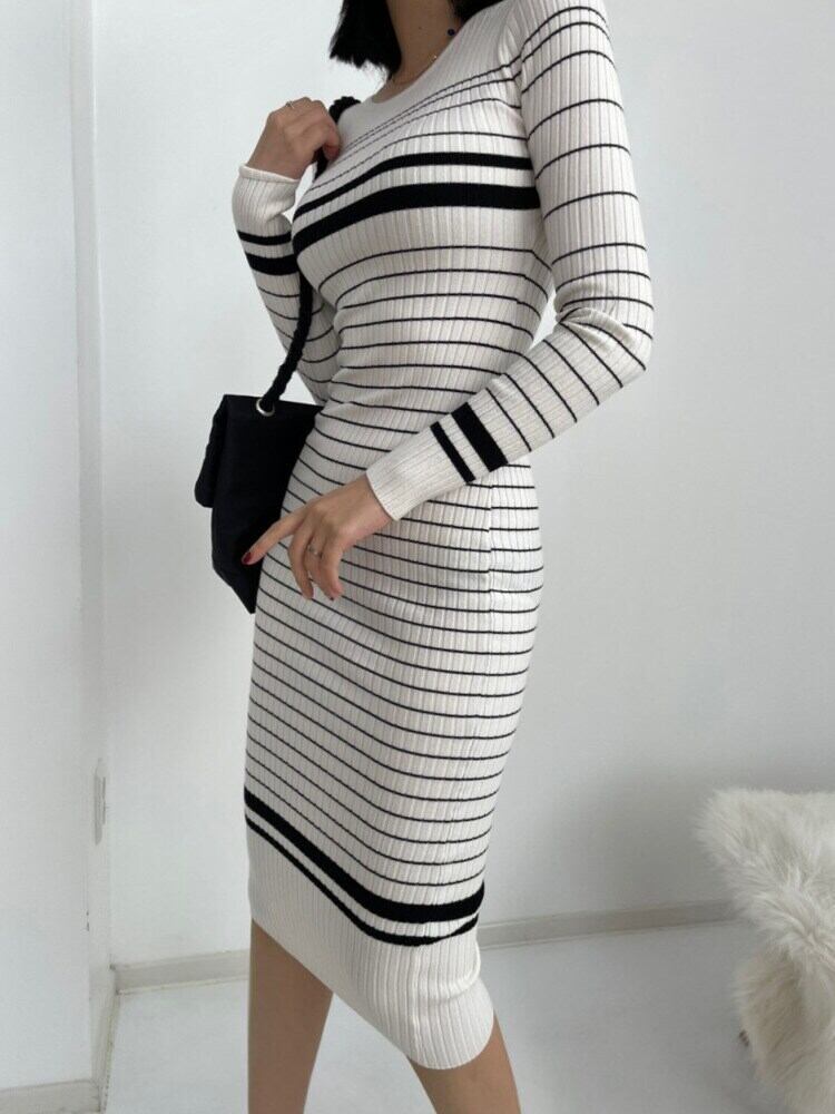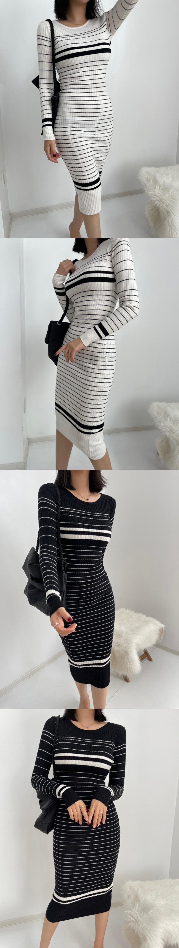 [EWQ] 長袖 O ネック プルオーバー ドレス春冬ストライプ コントラスト ニット ドレス暖かい 16Y5431 ロング スプリング 春物 ウィンター 冬物 Oネック