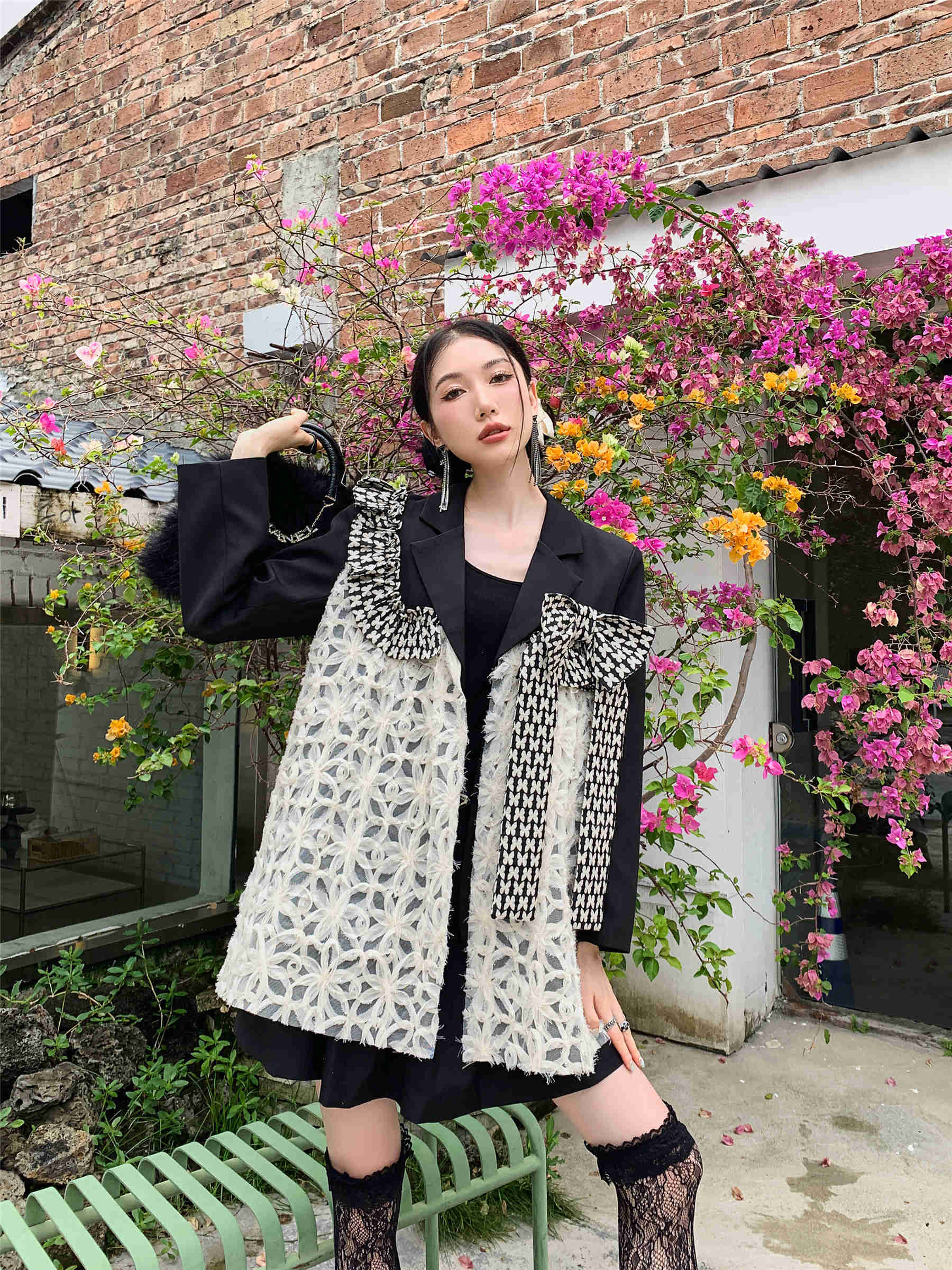 【EWQ】ストリートスタイル ロングスリーブ コート アシンメトリー フリル ボウ ブラック パッチワーク スーツ ビッグサイズ ロングブレザー 16Y346301 リボン 長袖