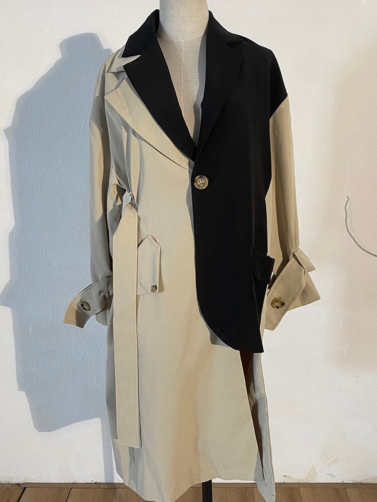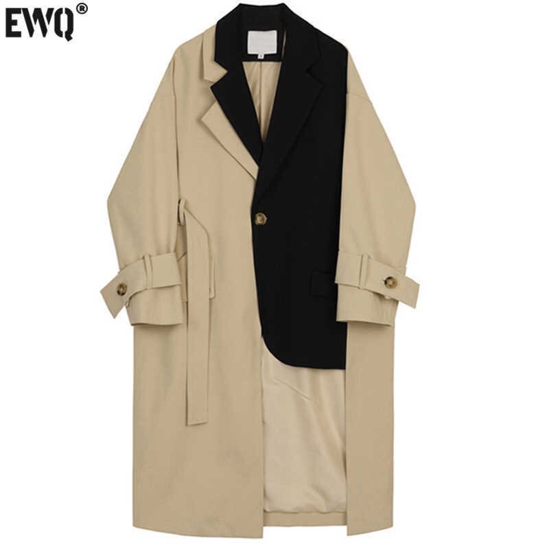[EWQ] 秋トレンド レディース ラペル コントラスト ステッチ ルーズ シン カーキ 長袖 ウインドブレーカー 春 ロング スプリング 春物 オータム 秋物