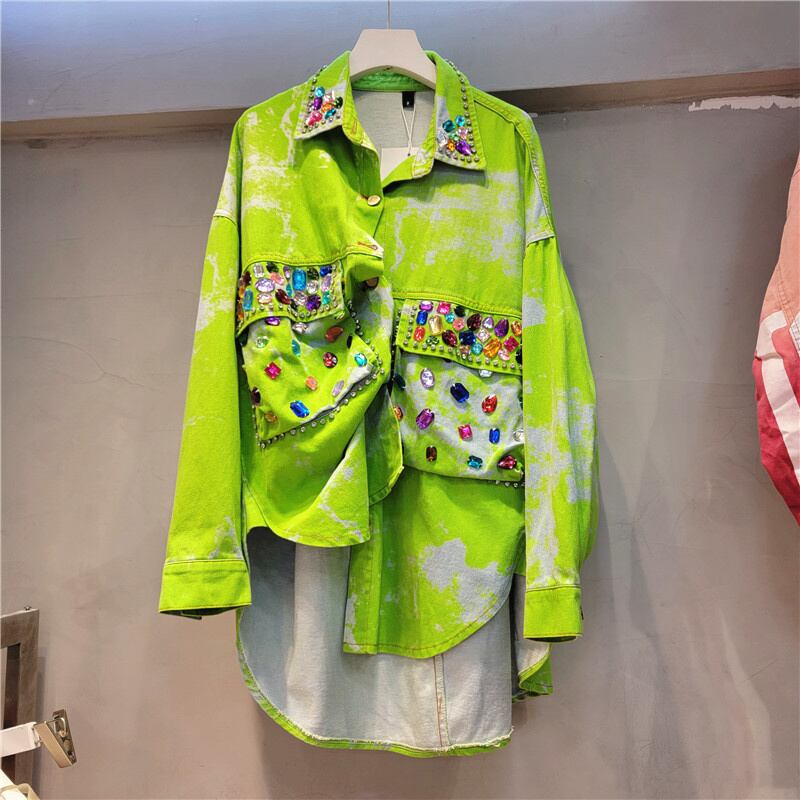 [EWQ] 色ビーズ ダイヤモンド カーディガン ジャケット非対称ポケット長袖グリーン デニム ジャケット コート春秋トップ ロング スプリング 春物 オータム 秋物