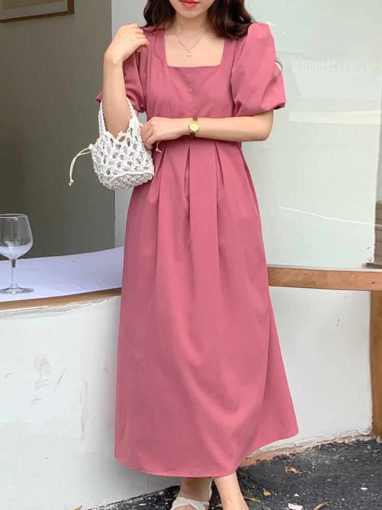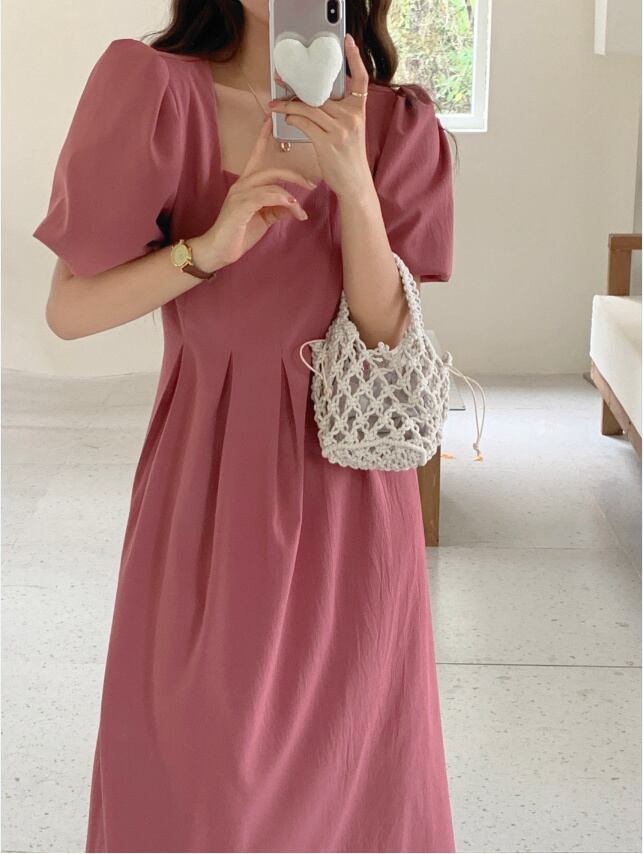 [EWQ] スクエア ネック プリーツ ウエスト ドレス パフ スリーブ レースアップ無地ドレス夏潮 Vestido 16Y7995 サマー 夏物 ソリッドカラー スクウェア