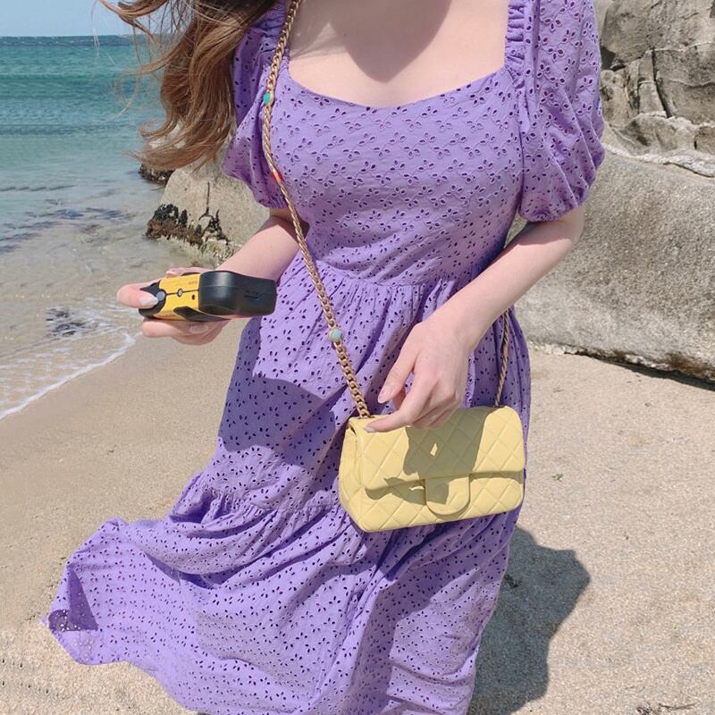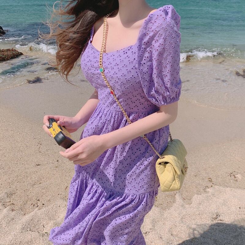 [EWQ] パープル スクエア カラー スリム パフ スリーブ ホリデー ロング ドレス ジャカード ホロウ アウト ドレス レディース シック サマー テンダー 夏物 スクウェア