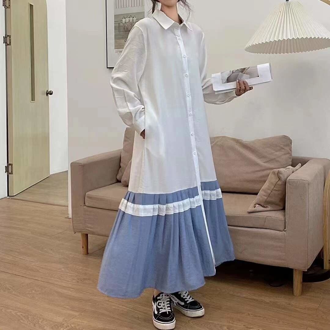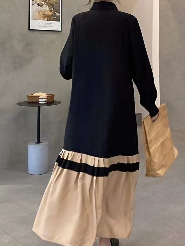 [EWQ] パッチワーク シングル ブレスト シャツ ドレスコントラスト長袖プリーツ ルーズ マキシ ドレス春秋 Vestido ロング スプリング 春物 オータム 秋物