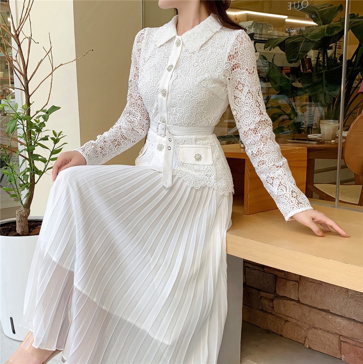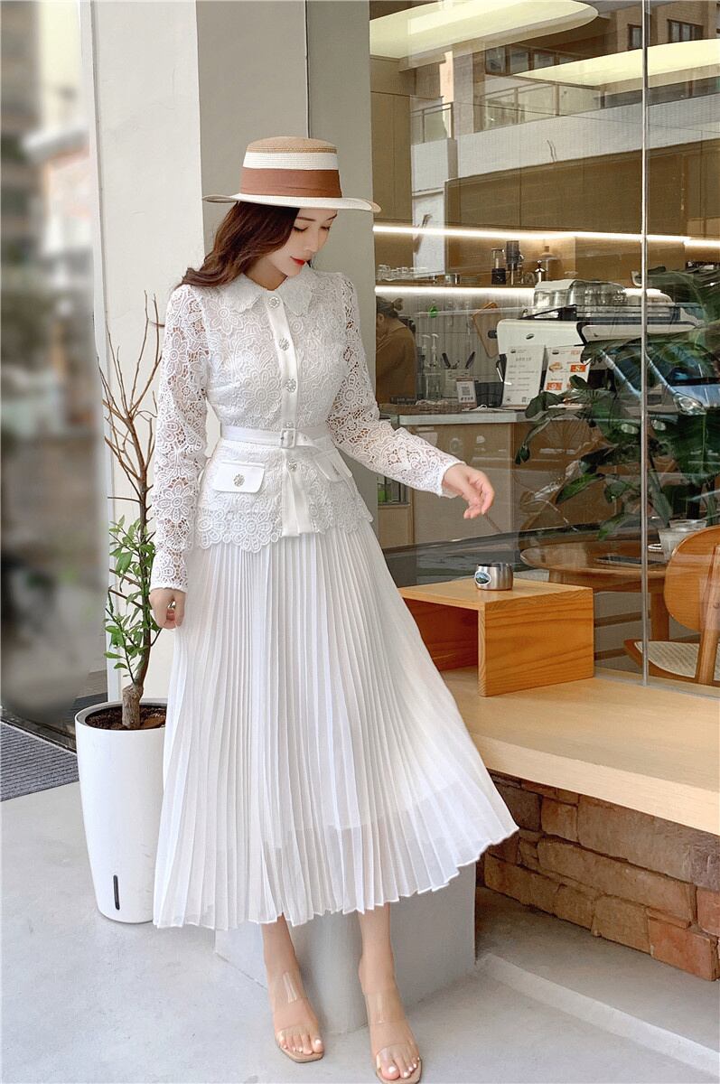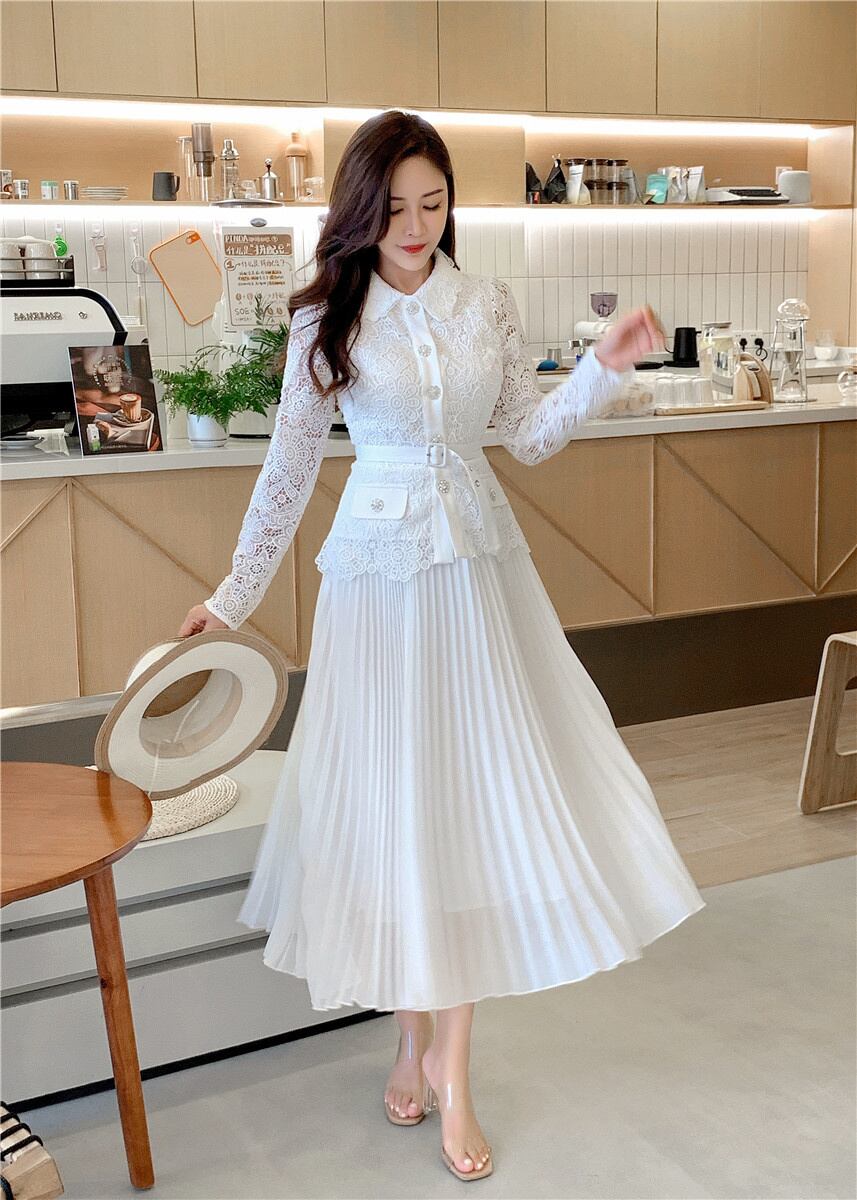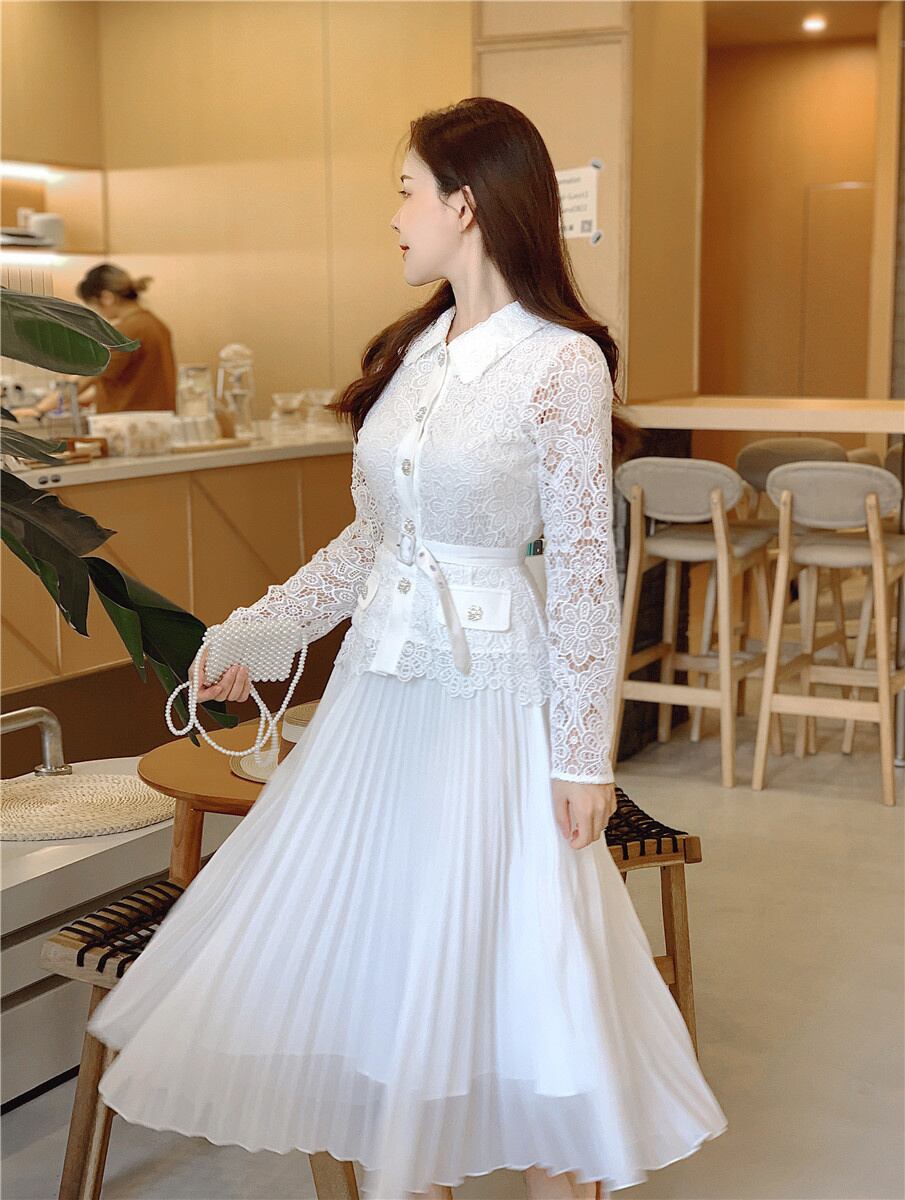 [EWQ] 秋春プリーツ ドレスラペル ダイヤモンド ボタン花柄刺繍レース パッチワーク シフォン ベルト 16Y6633 スプリング 春物 オータム 秋物 ハーネス