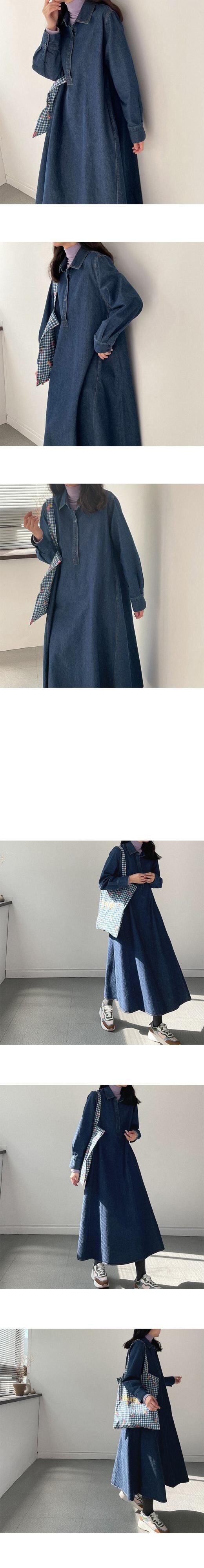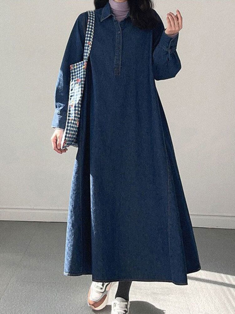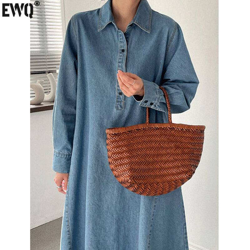 [EWQ] パフスリーブデニムドレスボタンターンダウンカラードレスライトブルーローブ春秋潮 Vestido スプリング 春物 オータム 秋物