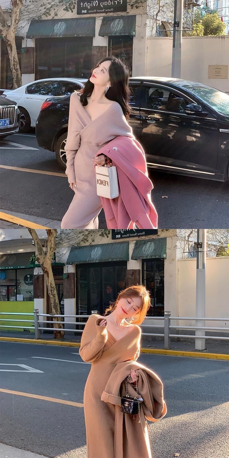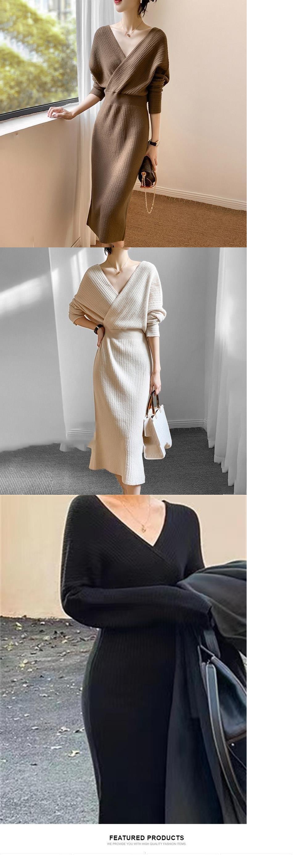 【EWQ】Vネック モダンレディ ロング 綺麗め セータードレス シック トレンド レディース ニット Vestidos 春 スプリング 春物