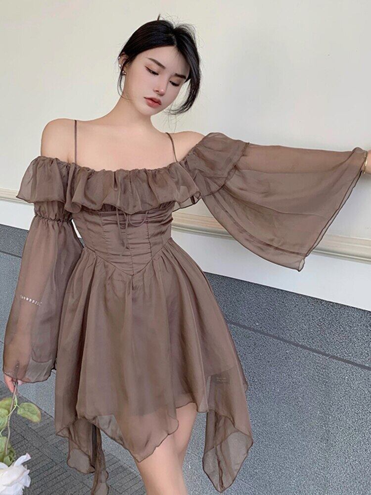 [EWQ] スリング ドレス フリル スプライシング ミニ ドレス ビーチ ホリデー不規則 Vestido 春夏潮 16Y6381 ラッフル スプリング 春物 サマー 夏物