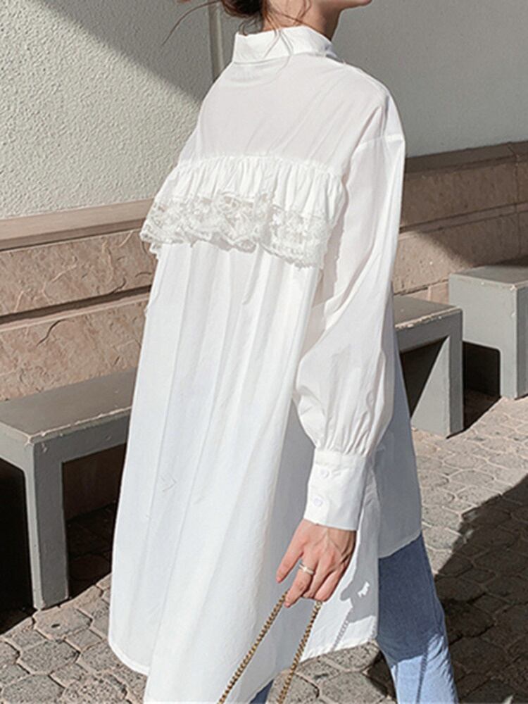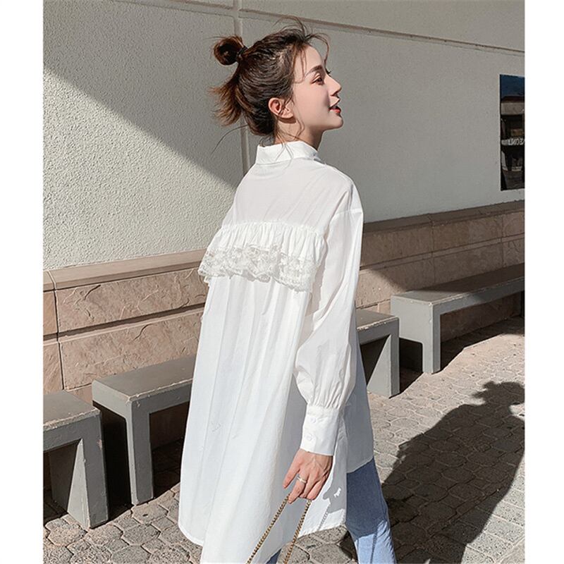 [EWQ] 甘いスタンドカラー長袖シャツ春秋レーススプライシング不規則ビッグサイズシャツ美しいトップス ロング 大人ガーリー スウィート キュート カジュアル スプリング 春物 オータム 秋物