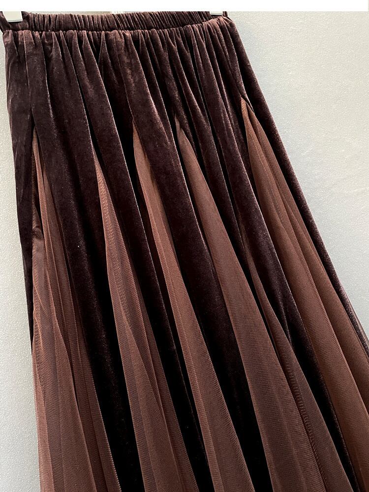 [EWQ] ベルベット メッシュ A ライン スカート弾性ウエスト カラー コントラスト ミッドカーフ スカート春秋ファルダ Y6144 エラスティック 伸縮 スプリング 春物 オータム 秋物 Aライン