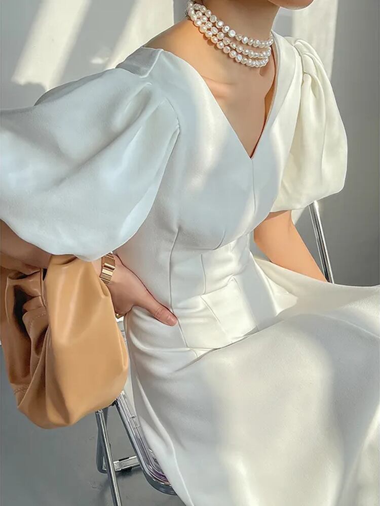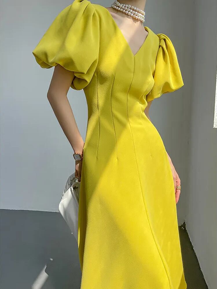 [EWQ] プリーツ パフ スリーブ スリム ウエスト ドレス V ネック無地マキシ ドレス夏潮 Vestidos 50 サマー 夏物 Vネック ソリッドカラー