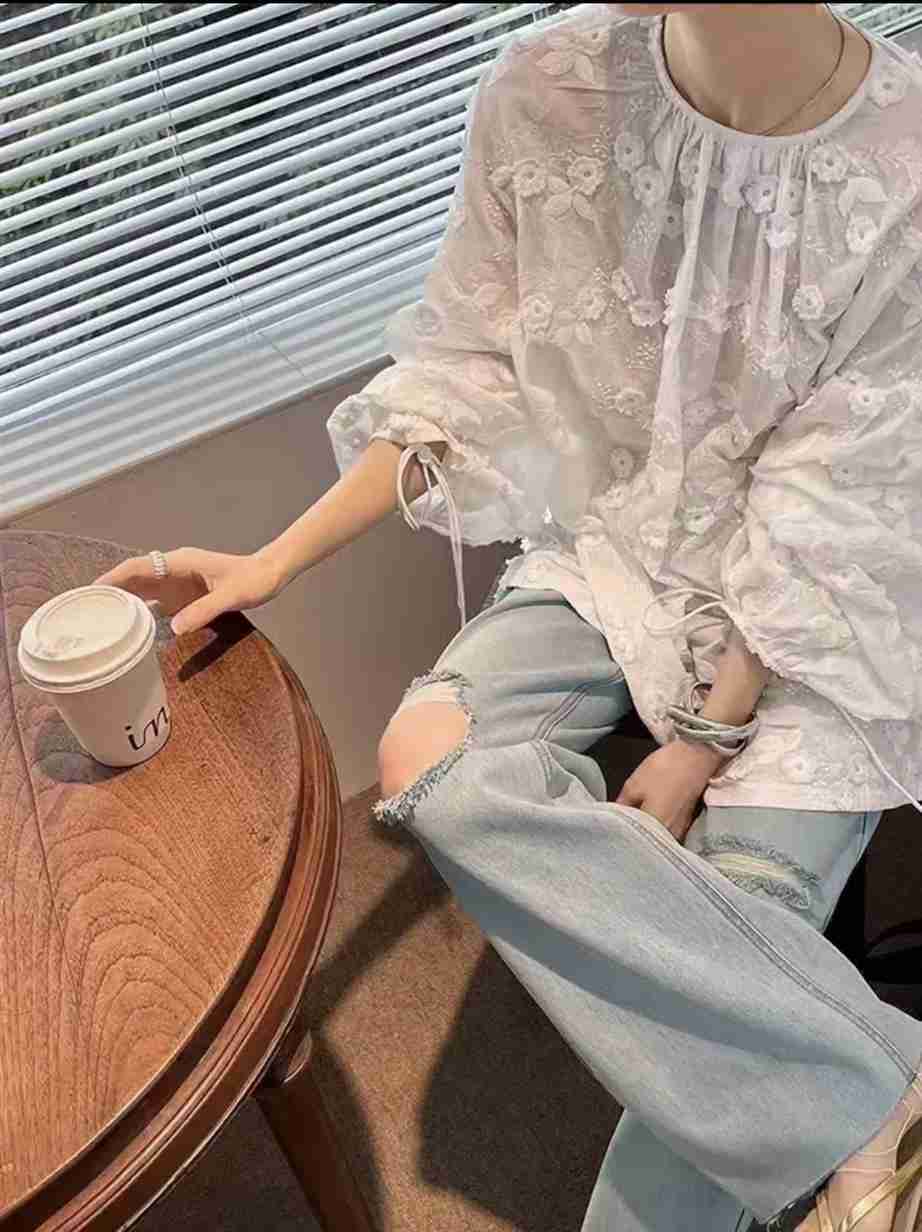 [EWQ] O ネック刺繍シャツ 3D 花ルーズ ランタン スリーブ ブラウス トップ春夏トップス Y7684 ランタンスリーブ スプリング 春物 サマー 夏物 Oネック フラワーデザイン