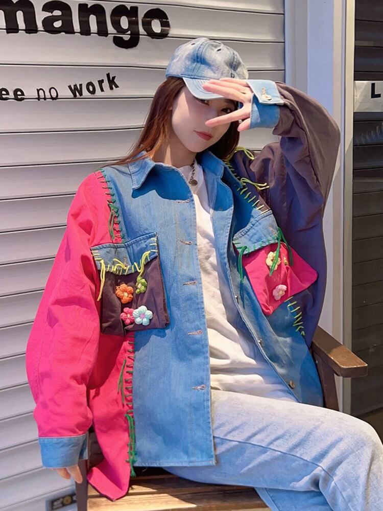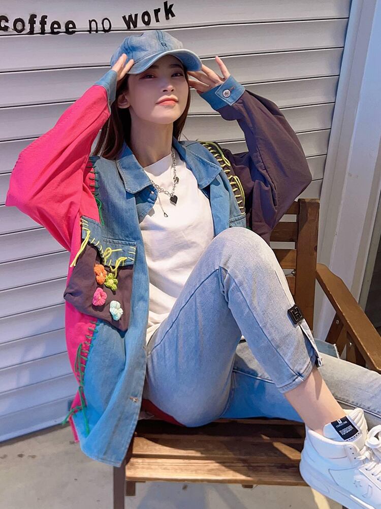 [EWQ] デニムパッチワーク長袖ビッグサイズシャツストリートスプライシングコントラストカラーブラウス春秋ルースコート ロング スプリング 春物 オータム 秋物