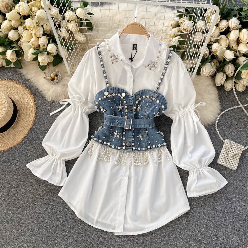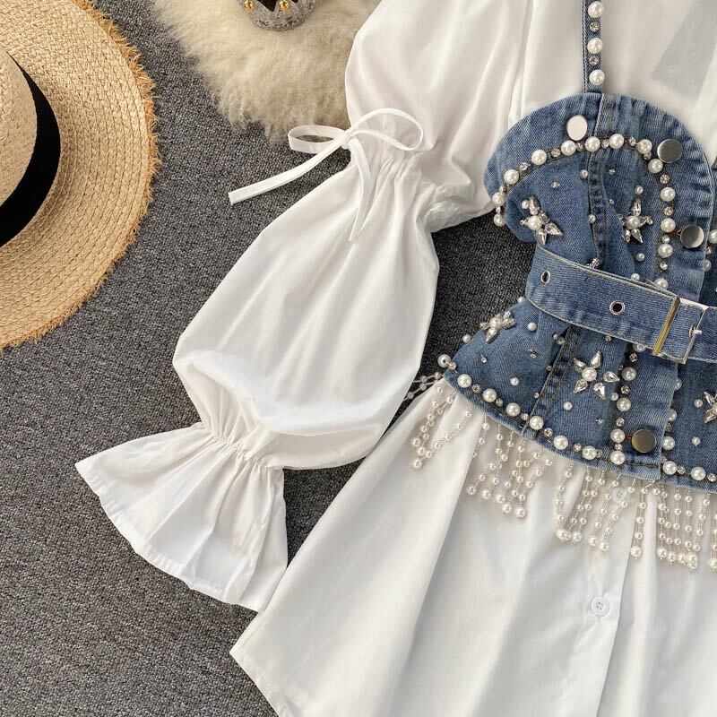 [EWQ] 春ブラウスダイヤモンド ビーズ パフ スリーブ Blusa トップ電話パール スリング チョッキ 2 ピース スタッキング シャツ Y6568F スプリング 春物 真珠