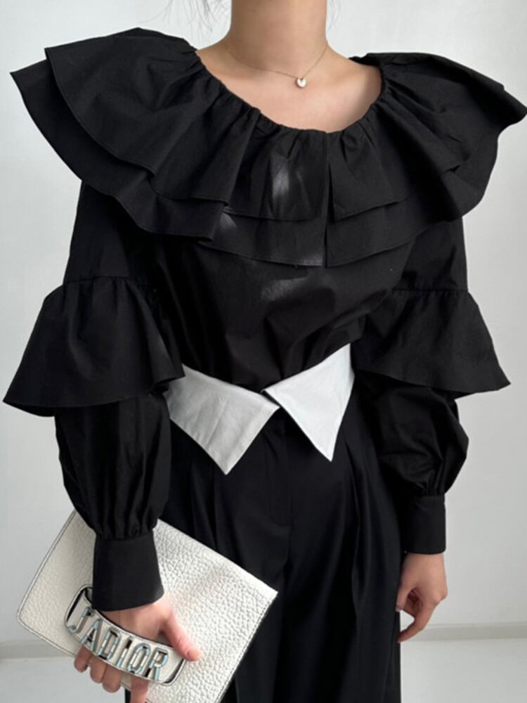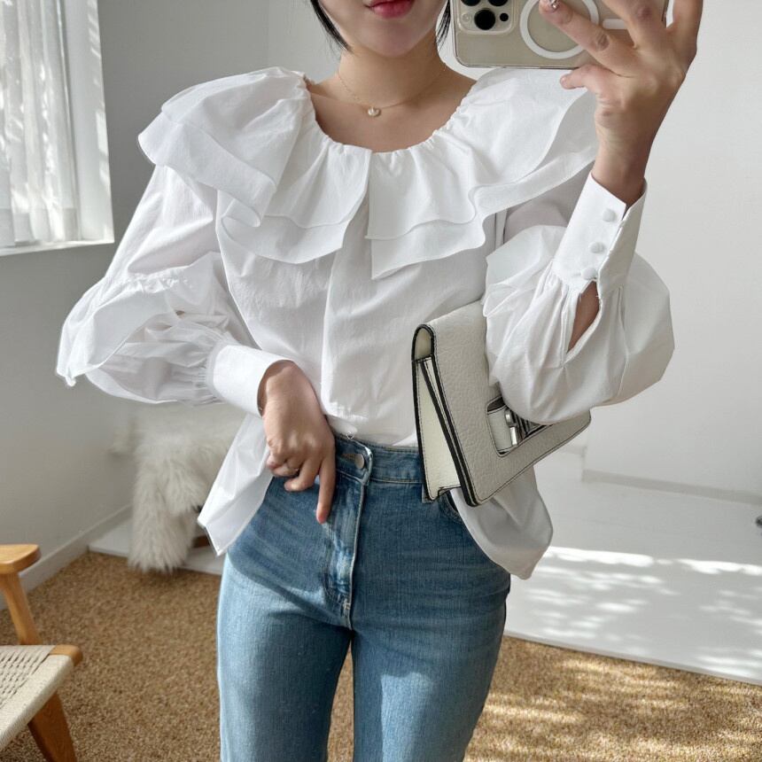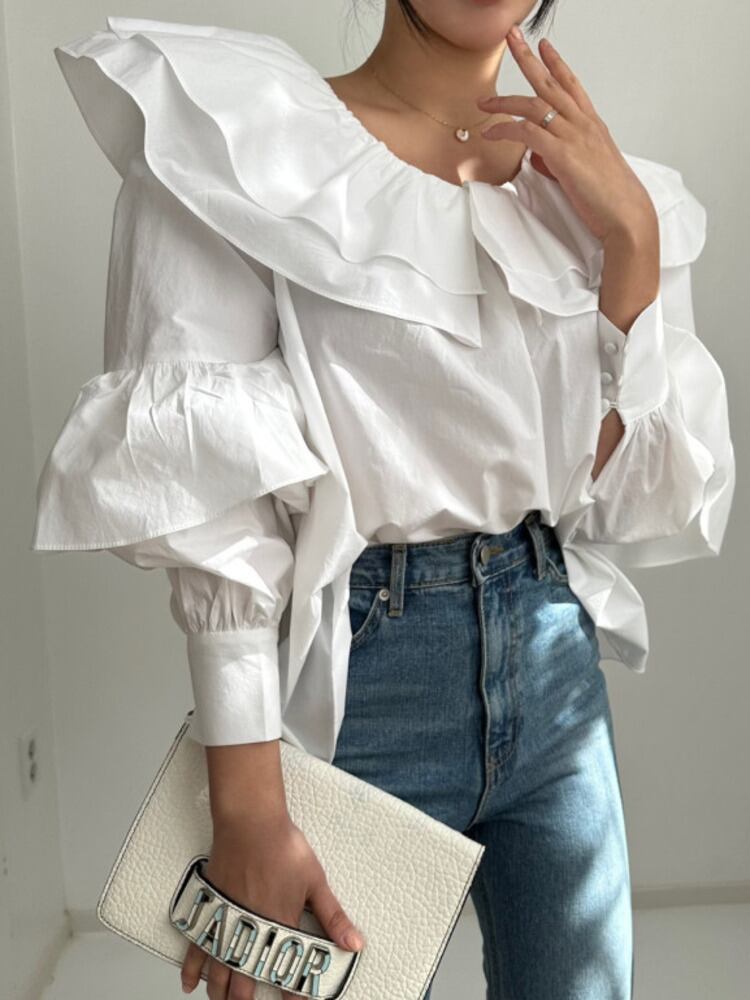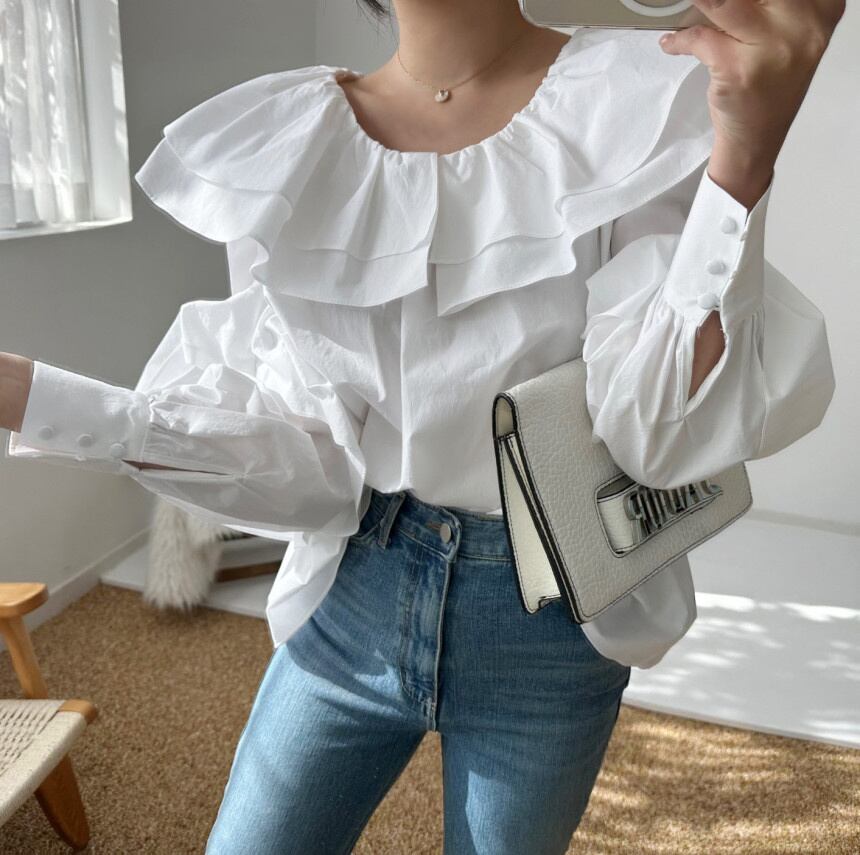 [EWQ] O ネック フリル スプライス無地シャツパフ スリーブ シンプルトップ春秋ルーズ シャツ トップス スプリング 春物 オータム 秋物 Oネック ソリッドカラー