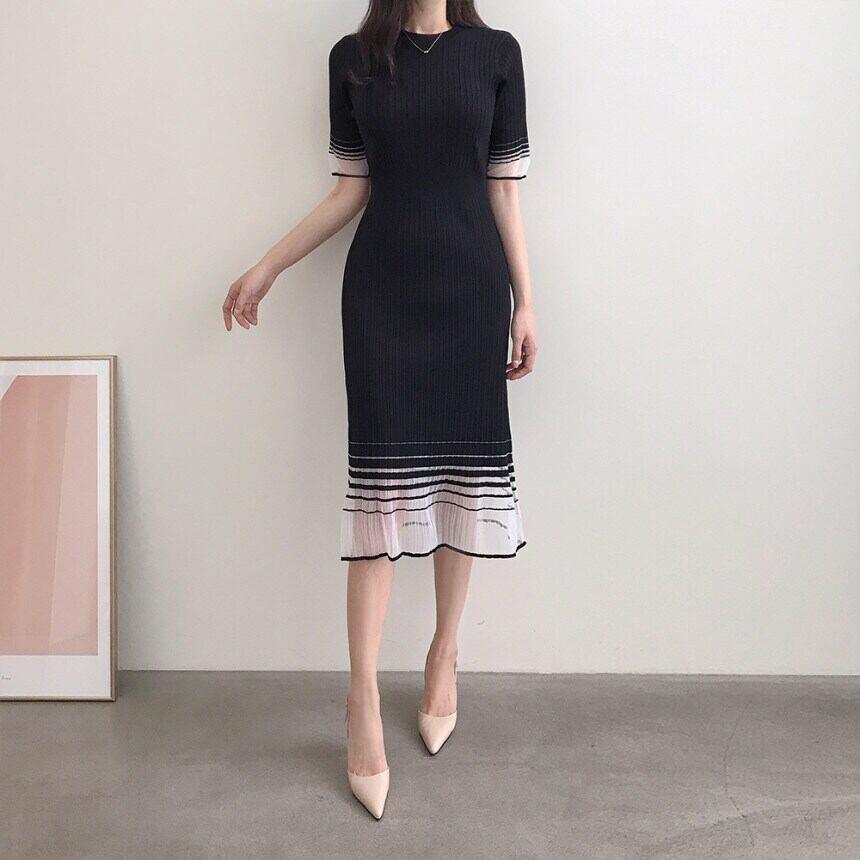 [EWQ] レディース グラデーションカラー ニットドレス サマー コントラスト Oネック ニットドレス 伸縮性 Vestido 269 エラスティック 夏物