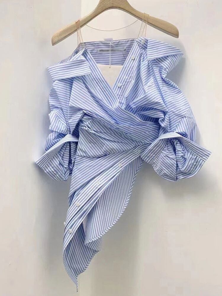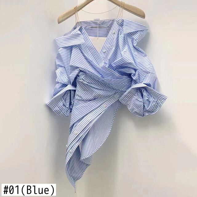[EWQ] 白シャツ レディース Vネック 長袖 オフショルダー パッチワーク ボタンシャツ 春服 スリムトップス ロング ホワイト スプリング 春物