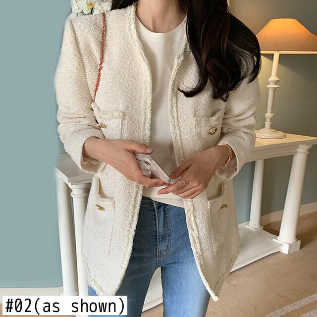 【EWQ】シック スプリング Oネック マルチポケット フリンジ ツイード ジャケット アウター ブラック コート 16Y2428 春物 ポケット多め