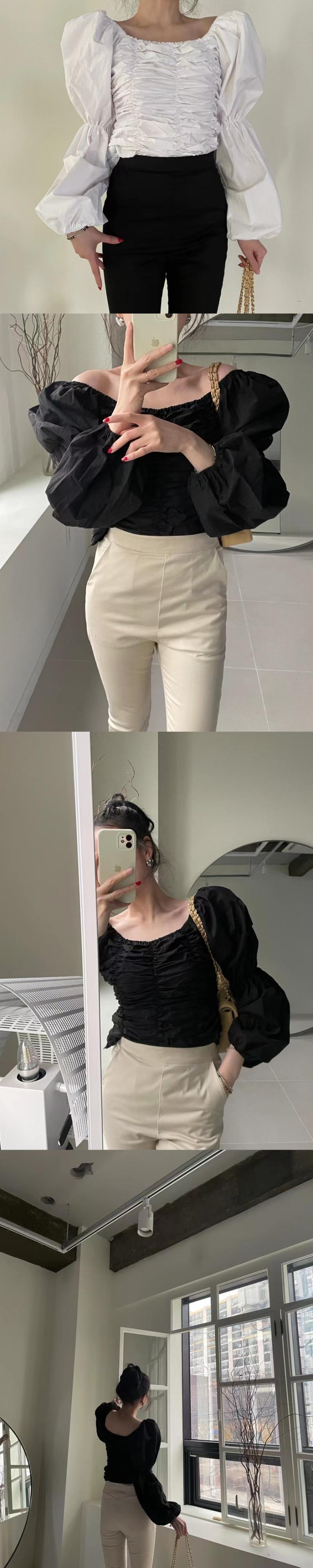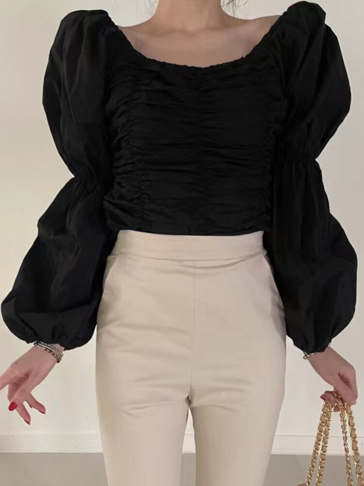 [EWQ] シックスクエアネックプリーツシャツパフスリーブ無地トップ春秋シャツ 16Y7046 スプリング 春物 オータム 秋物 ソリッドカラー スクウェア