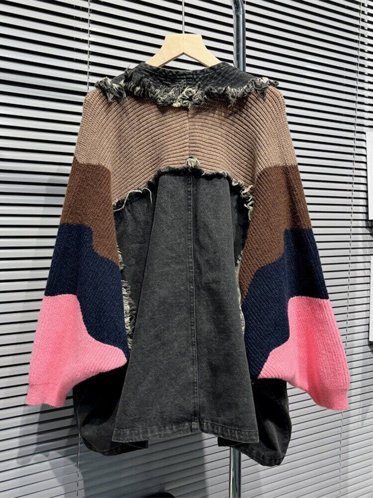 [EWQ] カラーブロックパッチワークデニムコート V ネック長袖アウター春秋服ビッグサイズコート ロング スプリング 春物 オータム 秋物 Vネック