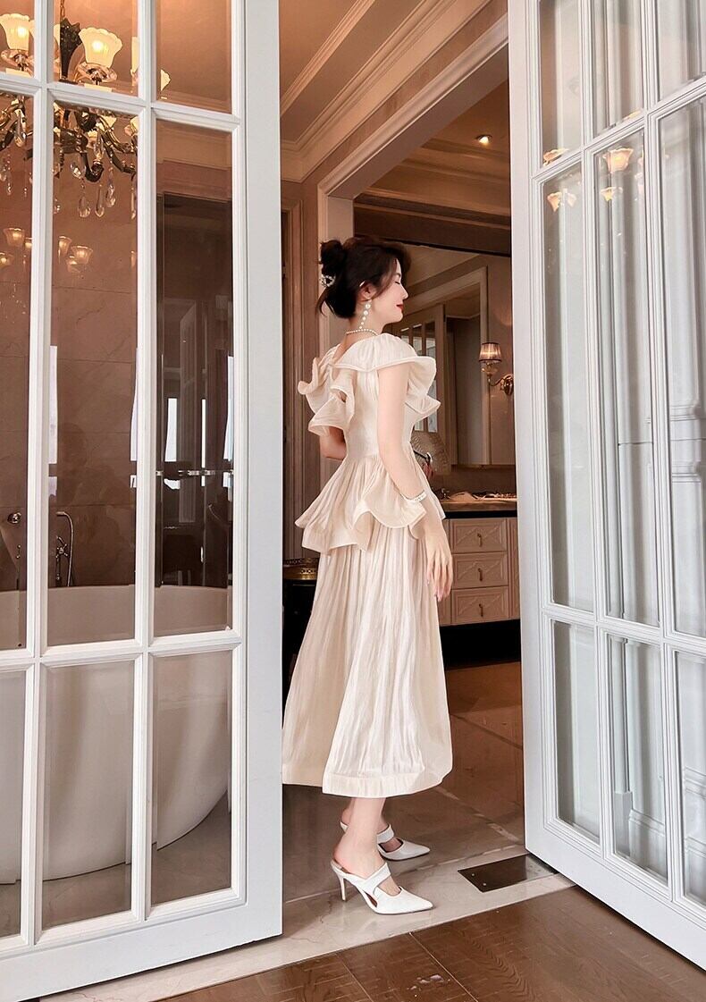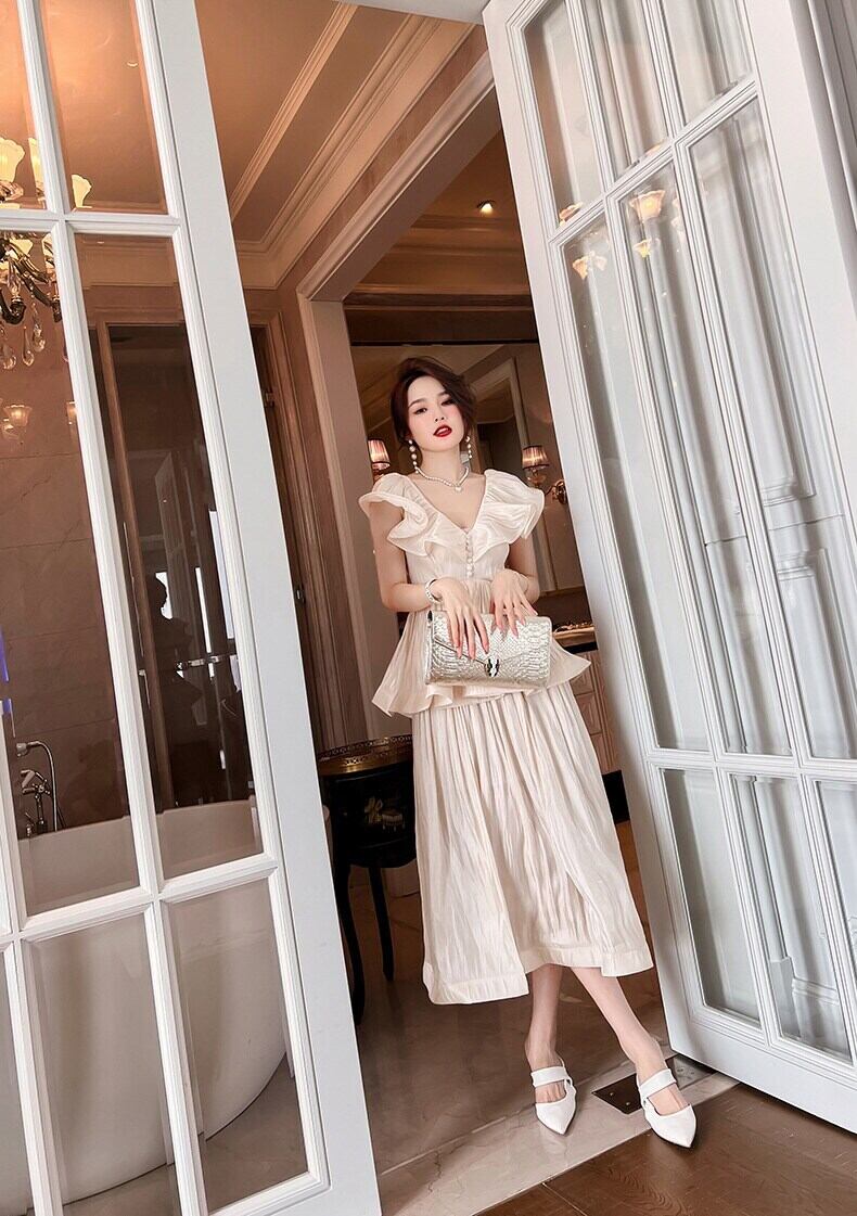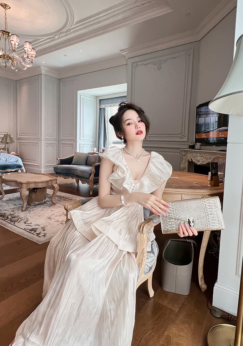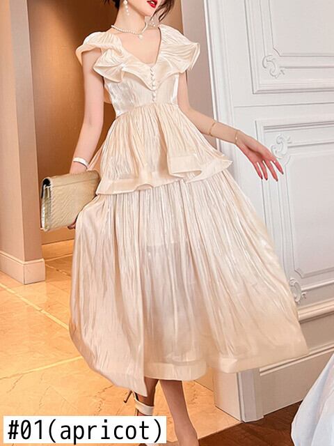 [EWQ] V ネック フリル スプライス ドレス夏半袖無地ドレス オールマッチ服 7398 ショート ハーフスリーブ サマー 夏物 Vネック ソリッドカラー