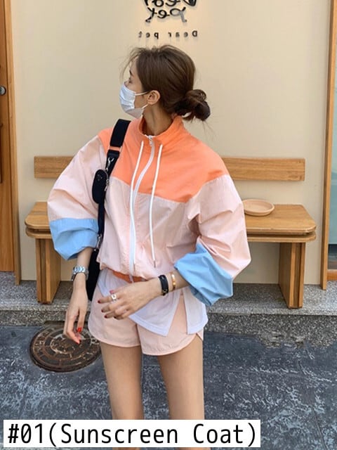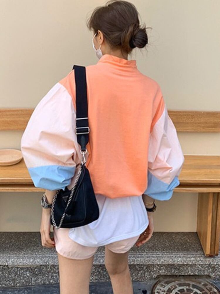 [EWQ] 巾着コントラスト長袖ジャケット春夏パッチワークジッパージャケットコートルーズトップ 16Y7325 ロング スプリング 春物 サマー 夏物