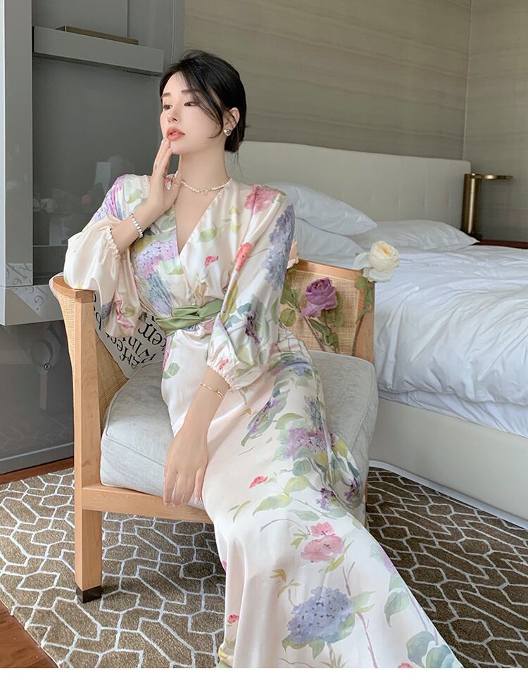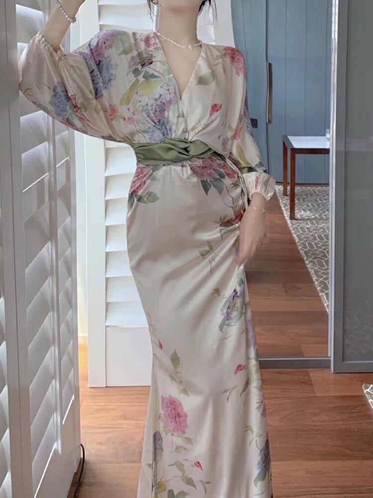 [EWQ] 甘いフラワー コントラスト カラー ドレス V ネック レースアップ ウエスト ホリデー ドレス春夏長袖プリント Rode ロング 大人ガーリー スウィート キュート カジュアル スプリング 春物 サマー 夏物 Vネック フラワーデザイン