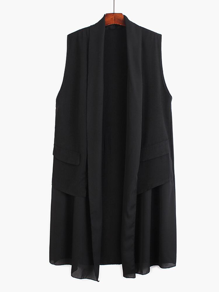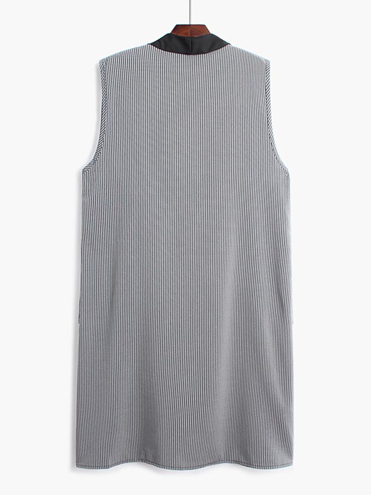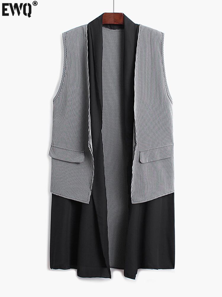 [EWQ] ブラック スプライス ストライプ ベスト レディース パッチワーク オープン ステッチ ポケット ノースリーブ ジャケット サマー トレンド チョッキ 夏物