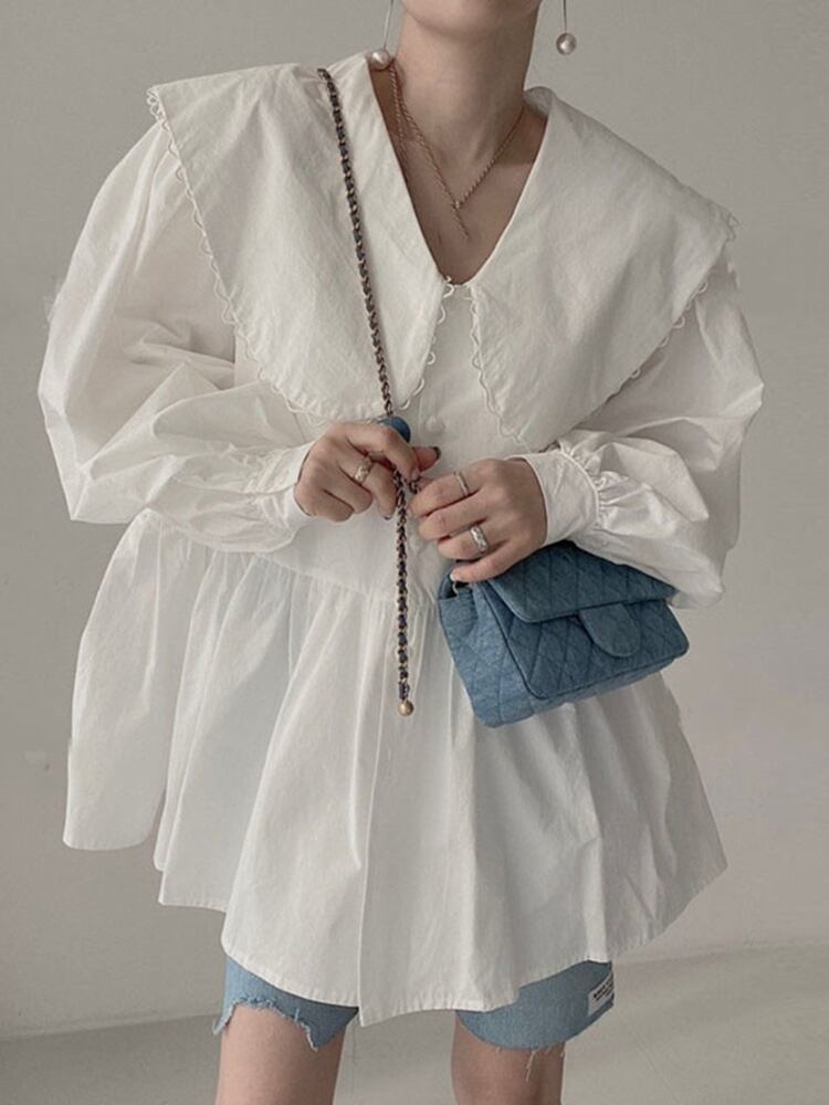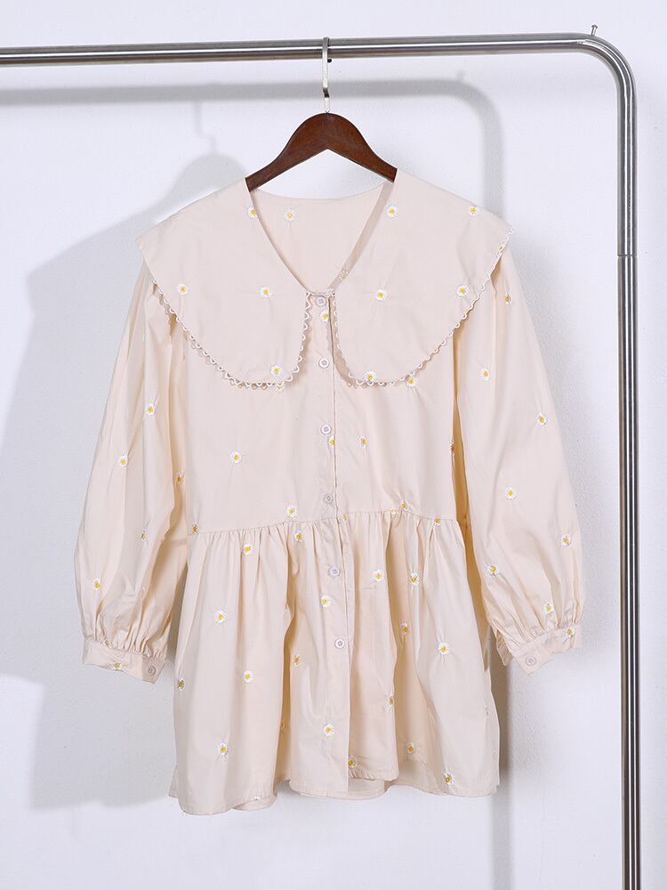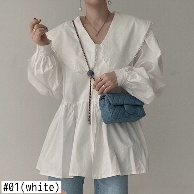[EWQ] ピーターパン襟中空アウト刺繍ひだルーズパフスリーブシャツ春ブラウス 16T586 スプリング 春物