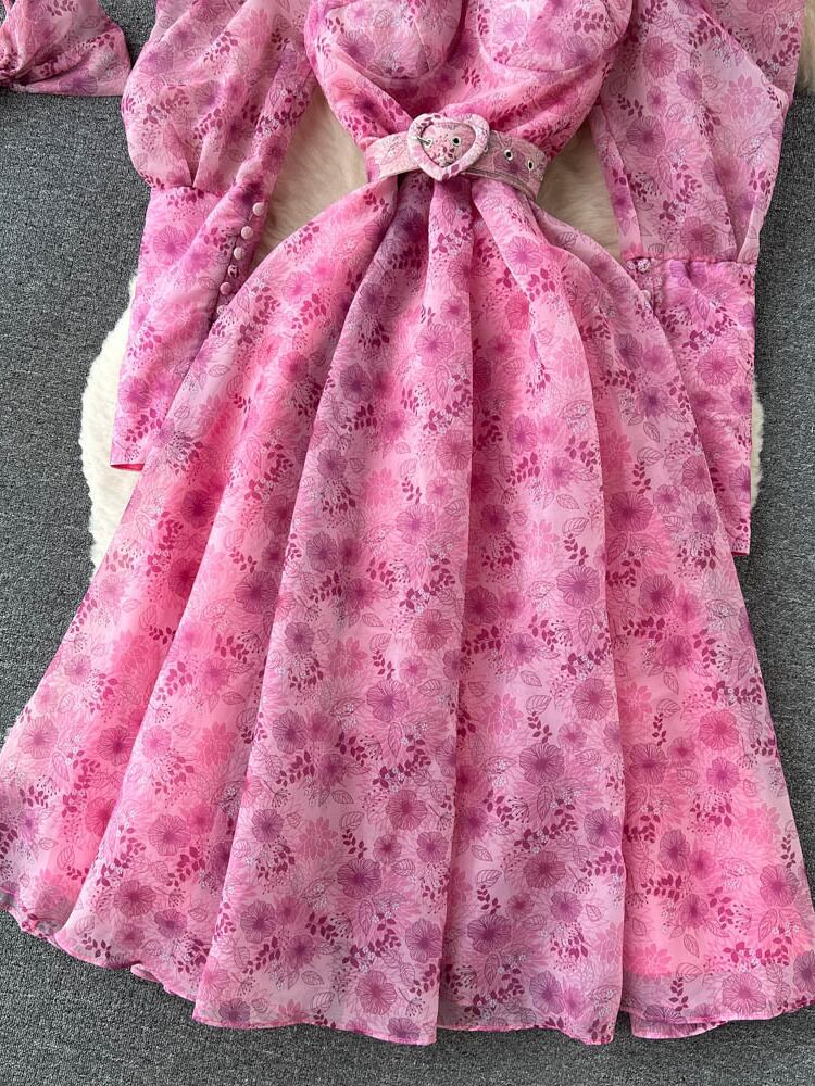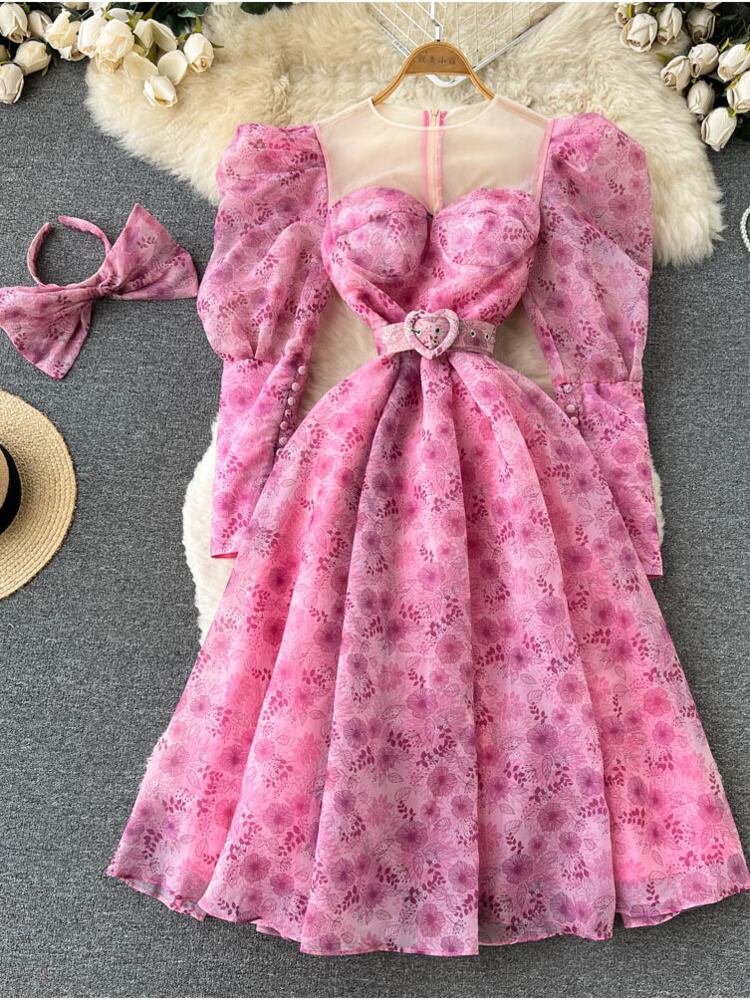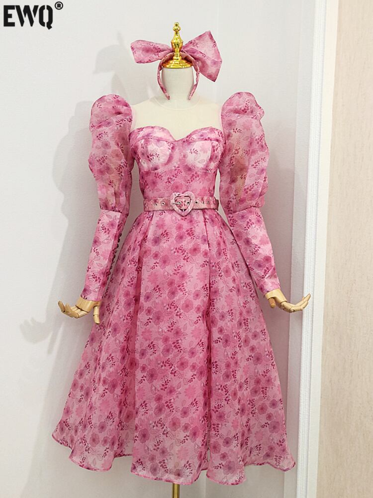 [EWQ] 甘いメッシュプリントパフスリーブ美しいドレス美しいイブニングスリムパーティードレスモダンレディ Vestidos 16Y6159 大人ガーリー スウィート キュート カジュアル