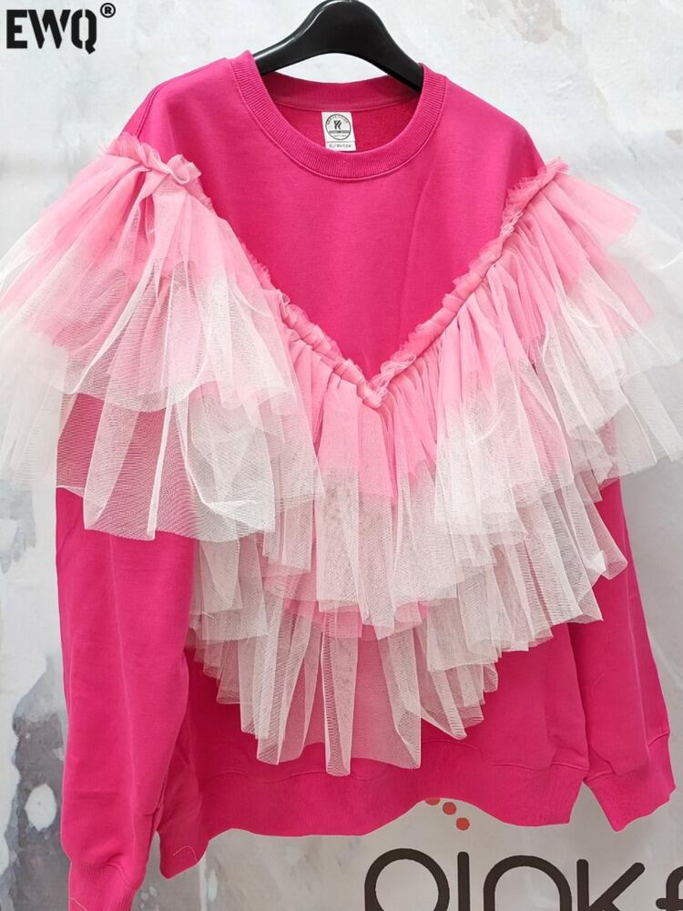 [EWQ] 美しいメッシュスプライシング Tシャツ長袖 Tシャツトップ春秋ルーズコットン Tシャツトップス 7030 ロング スプリング 春物 オータム 秋物