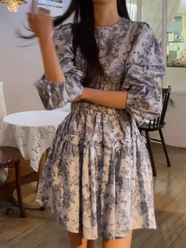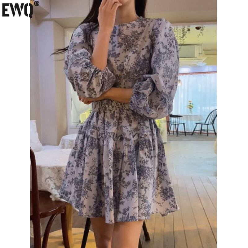 [EWQ] プリントコントラストミニドレス弾性ウエストプリーツ O ネック A ラインドレス春夏レジャー Vestido 698 エラスティック 伸縮 スプリング 春物 サマー 夏物 Oネック Aライン