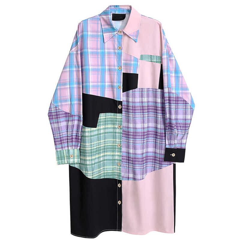 [EWQ] ラペル 長袖 パッチワーク ゆったり 秋 レディース コントラストカラー チェック柄 シャツワンピース 潮紫 ロング オータム 秋物 パープル
