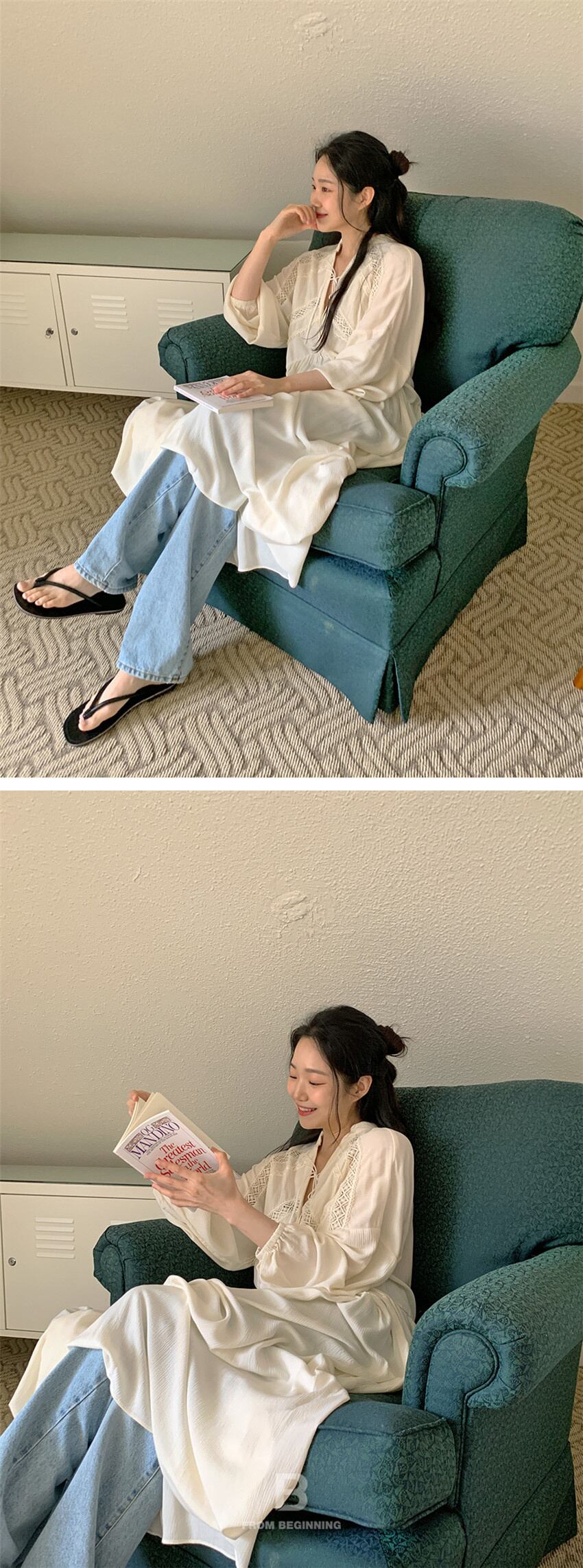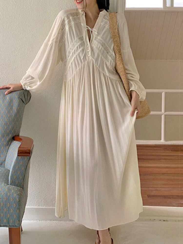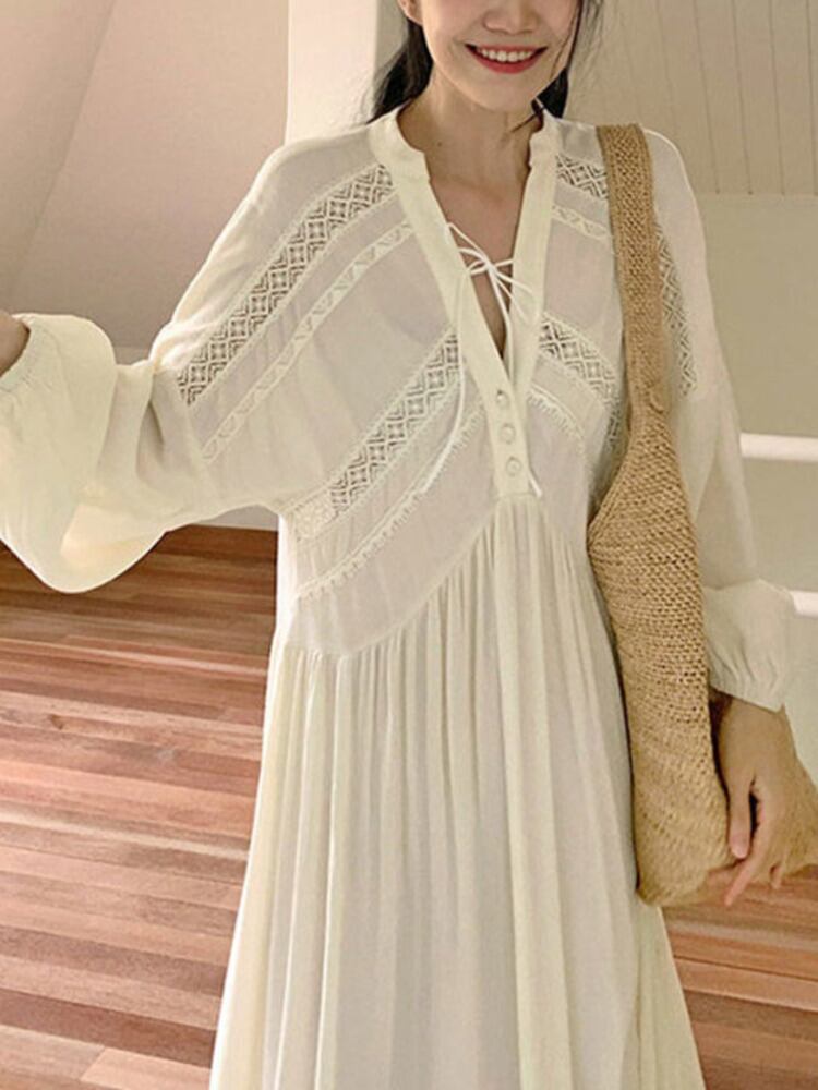 [EWQ] レースアップ中空アウト フック フラワー ドレス無地ルーズ V ネック ドレス春夏 Vestido 6687 スプリング 春物 サマー 夏物 Vネック ソリッドカラー フラワーデザイン