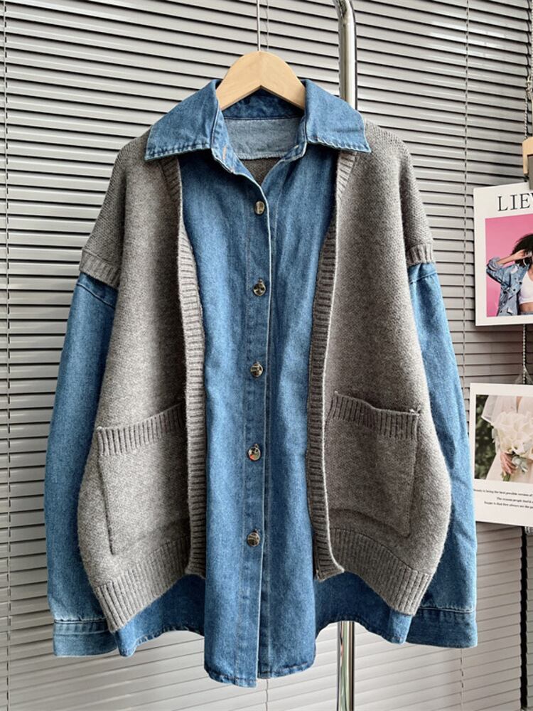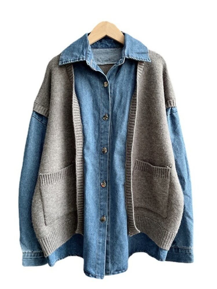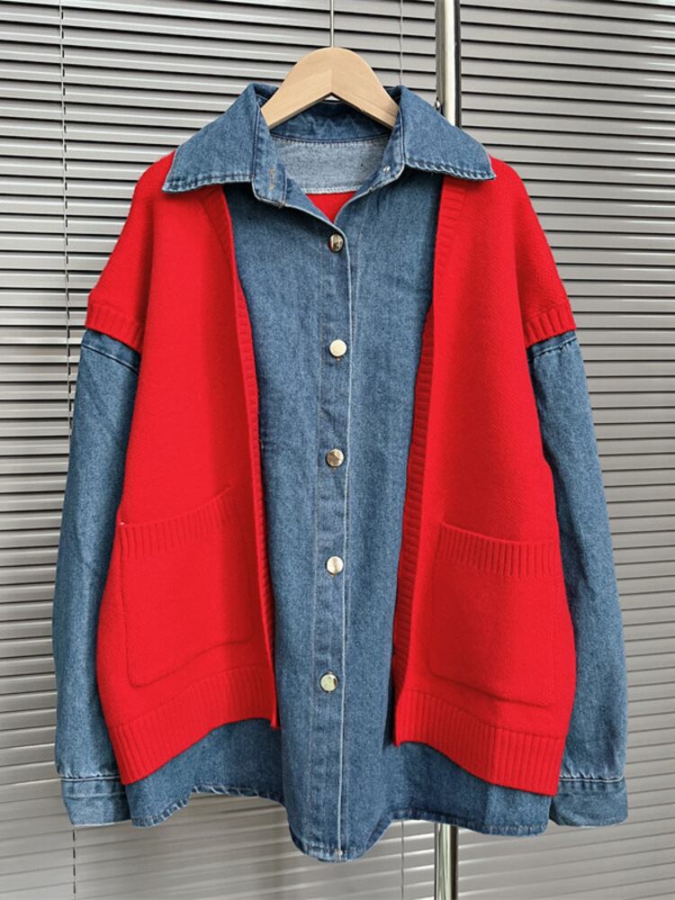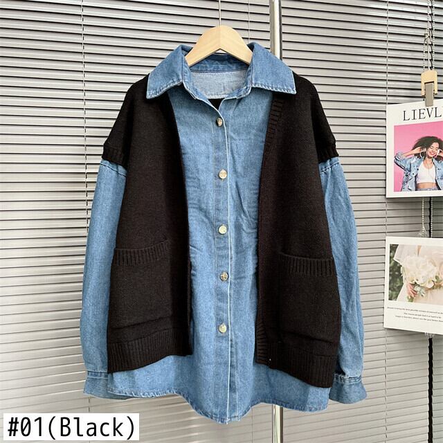 [EWQ] セーター ベスト スプライシング デニム コート レディース 厚手 ツー フェイク ピース ロング スリーブ ジャケット 春 秋 オーバーコート 16Y5859 長袖 スプリング 春物 オータム 秋物