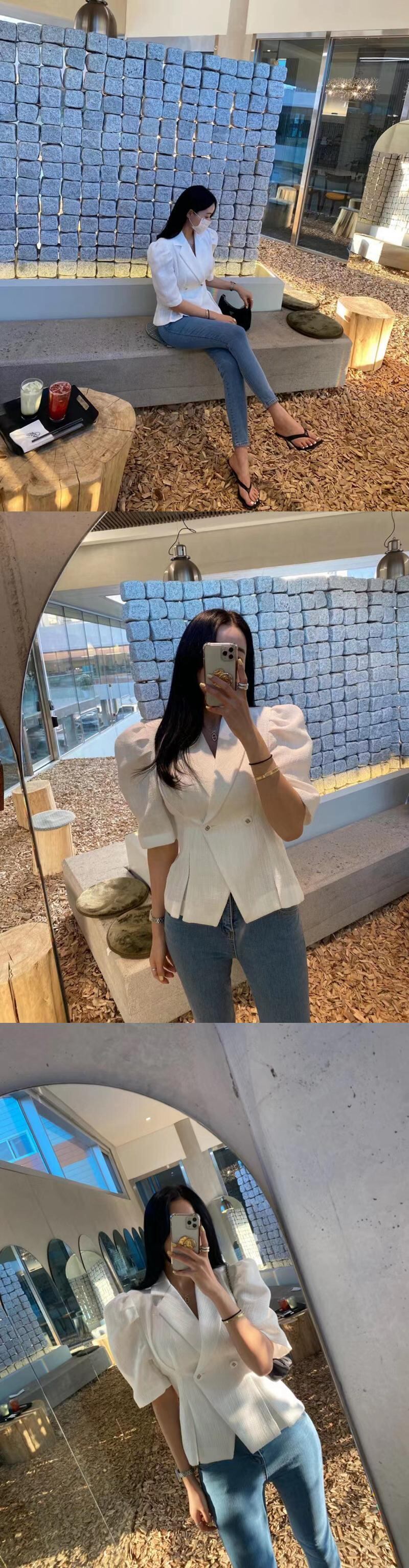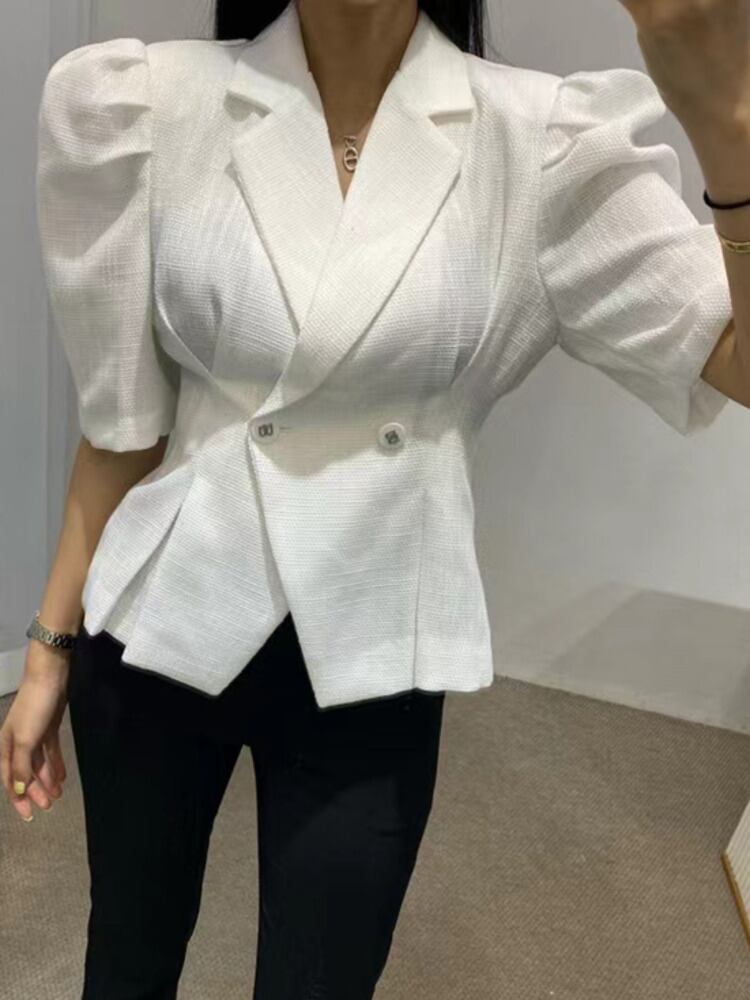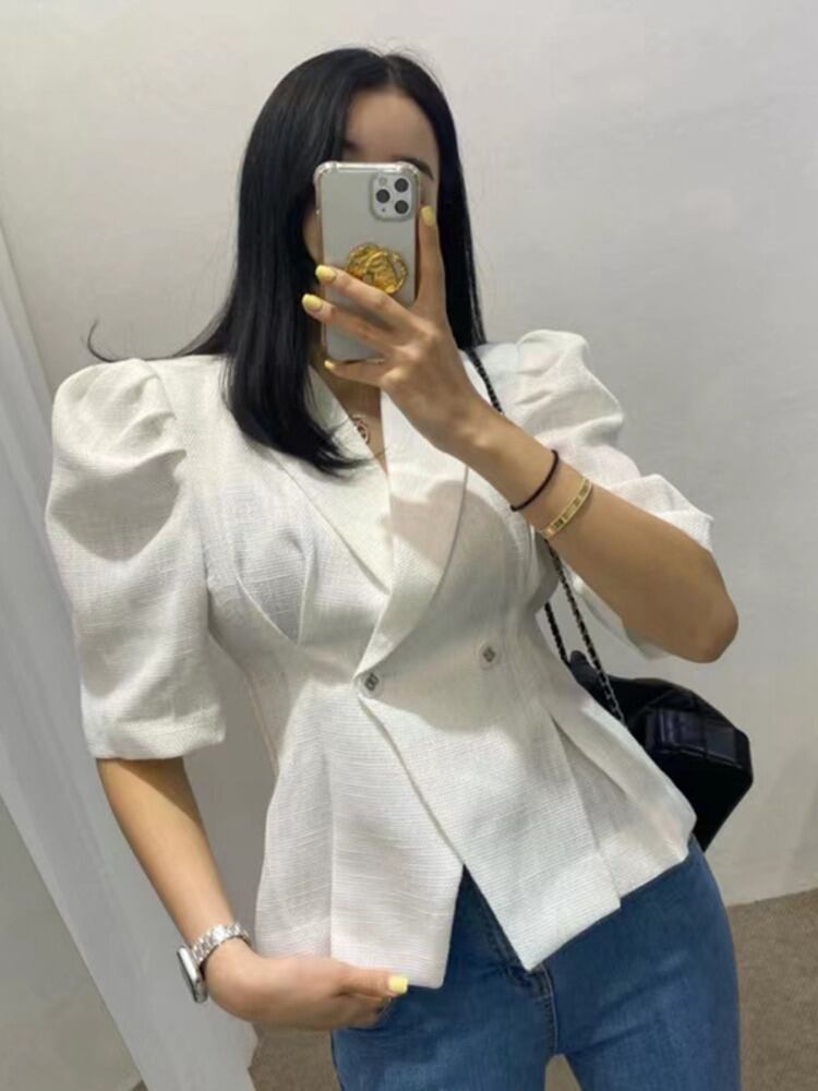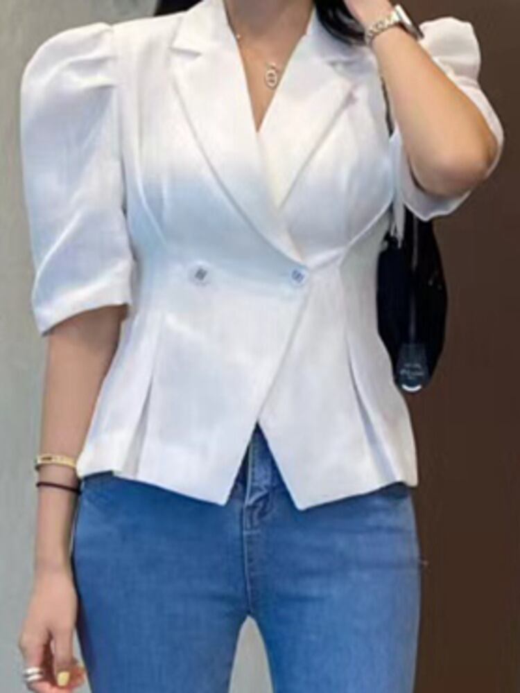 [EWQ] レディース ダブルブレスト ツイード ショート ジャケット スリム ウエスト 無地 半袖 コート サマー タイド トップ 16Y7941 ハーフスリーブ 夏物 ソリッドカラー