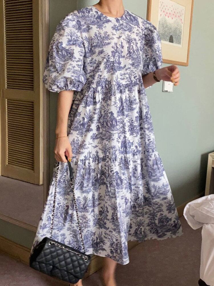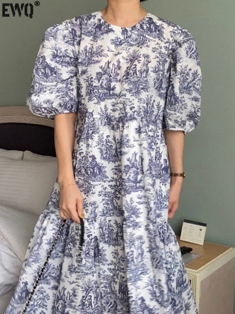 [EWQ] コントラスト プリント ルーズ バブル スリーブ ドレスピンク半袖ドレス春夏 Vestido ショート ハーフスリーブ スプリング 春物 サマー 夏物