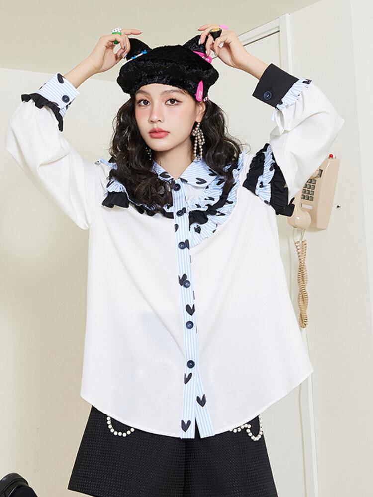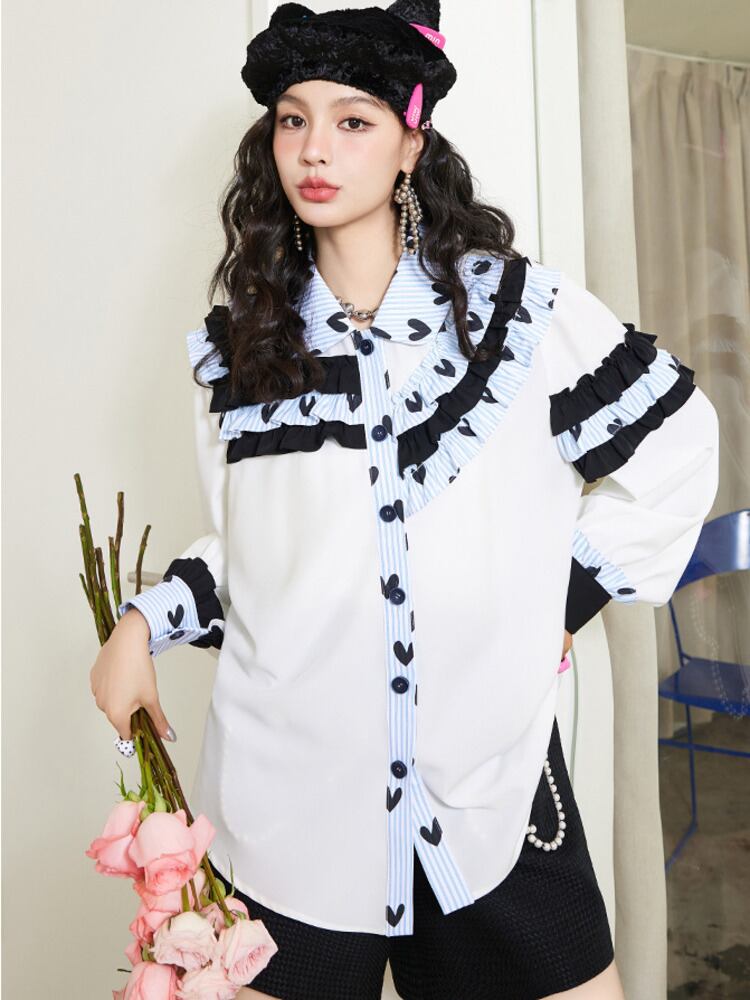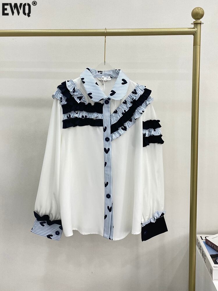 [EWQ] コントラストカラーイレギュラーフリルスプライスシャツレディースラプルパッチワークシングルブレストブラウス春秋 スプリング 春物 オータム 秋物