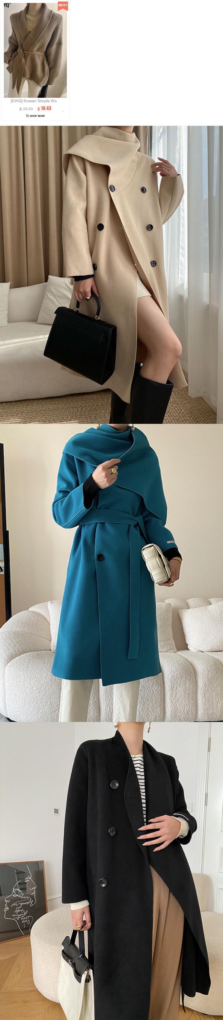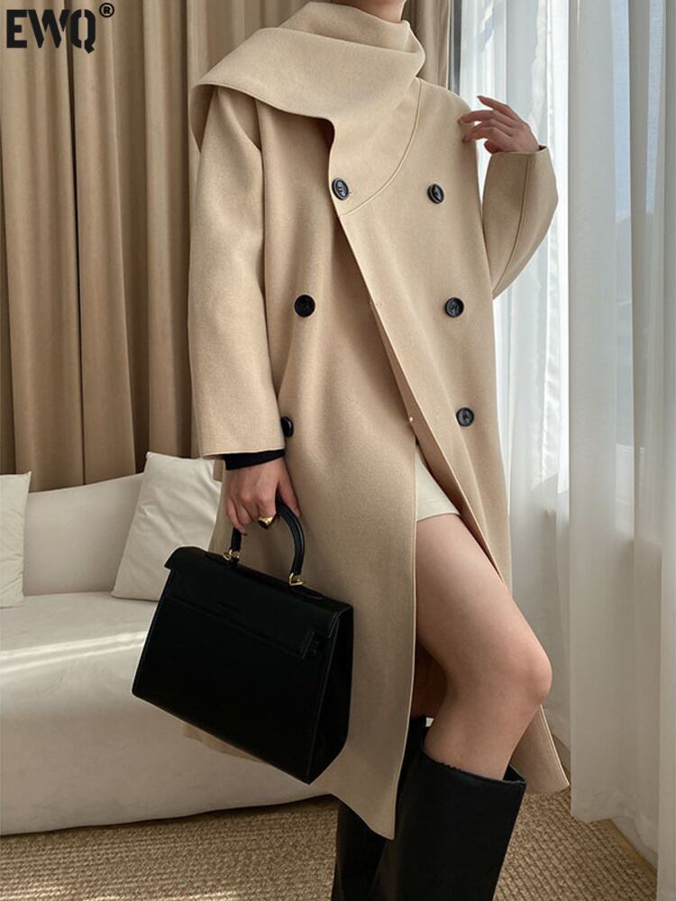 [EWQ] 不規則スカーフ襟スプライシングされたウールコート秋冬ルースダブルブレストブラックウールジャケットトップ オータム 秋物 ウィンター 冬物