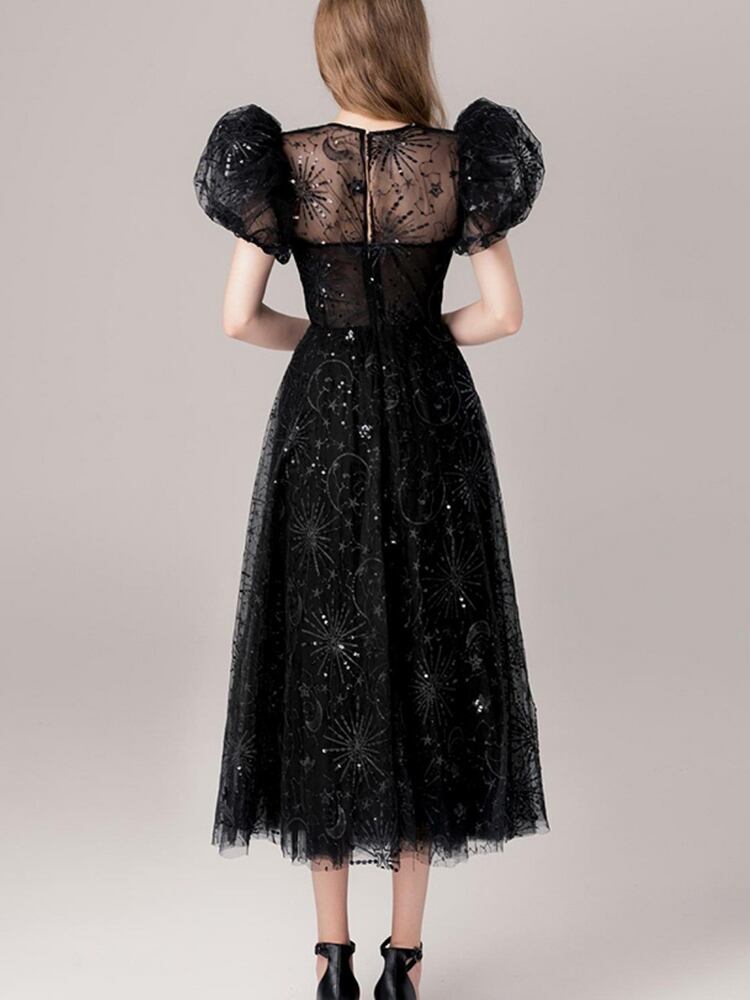 [EWQ] スパンコールメッシュ刺繍ドレスパフスリーブ黒イブニングパーティードレス夏潮 Vestido 467 ブラック サマー 夏物