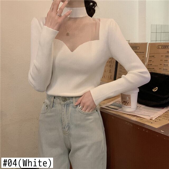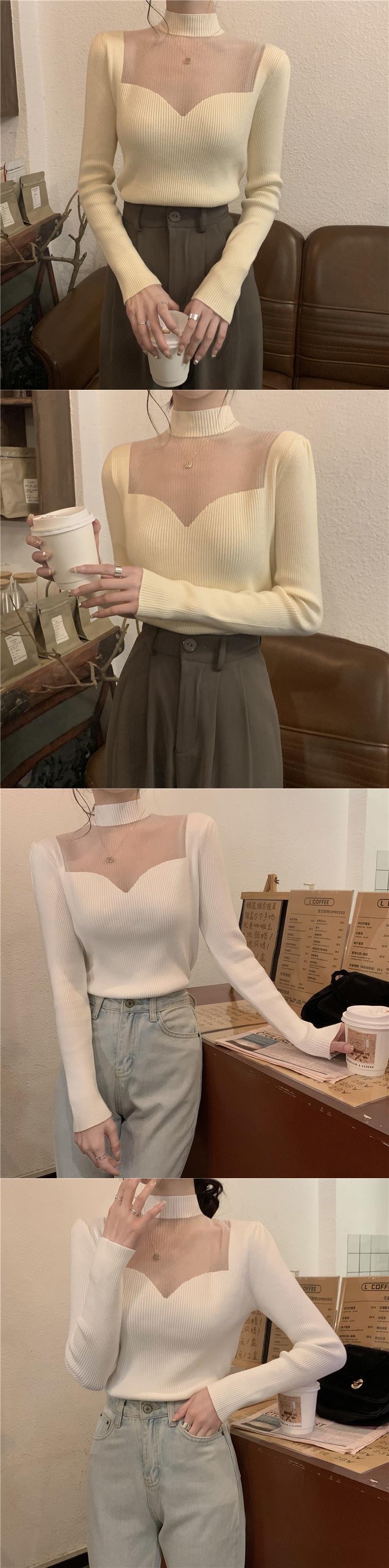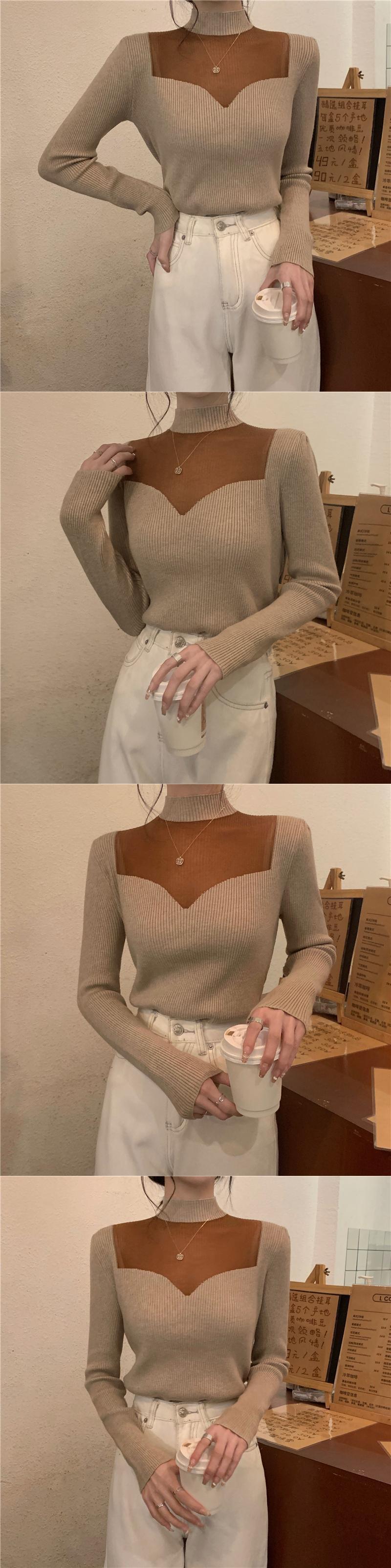 [EWQ] スウィート レディース スプライシング パースペクティブ ガーゼ プルオーバー 春 長袖 ハーフカラー ニット ベーシック プルオーバー 16Y5524 ロング 大人ガーリー キュート カジュアル スプリング 春物