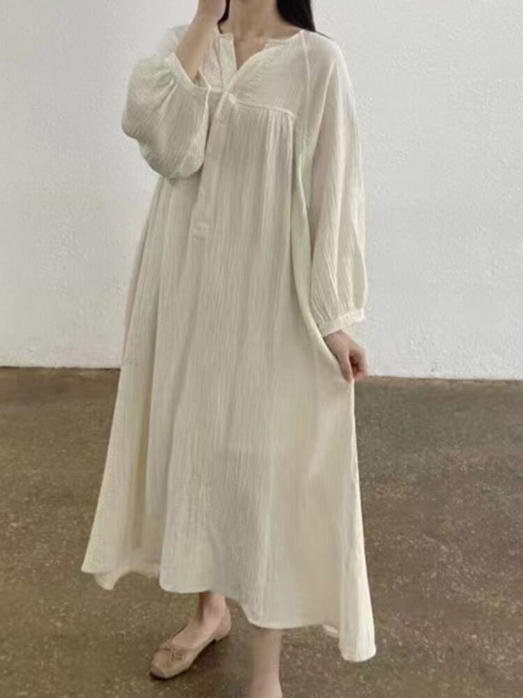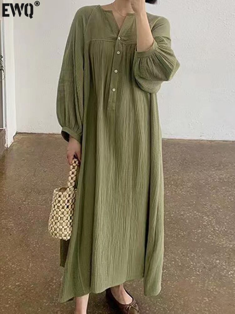 [EWQ] シングルブレストドレスパフスリーブ無地ルーズ因果マキシドレス春夏潮 Vestido スプリング 春物 サマー 夏物 ソリッドカラー